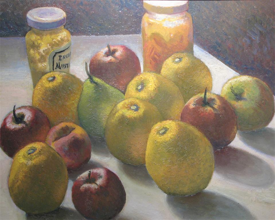 Ken Leech (20th Century) Still life - fruit and jars Signed, dated '89 and titled verso Oil on board 46 x 55cm; 18 x 21in