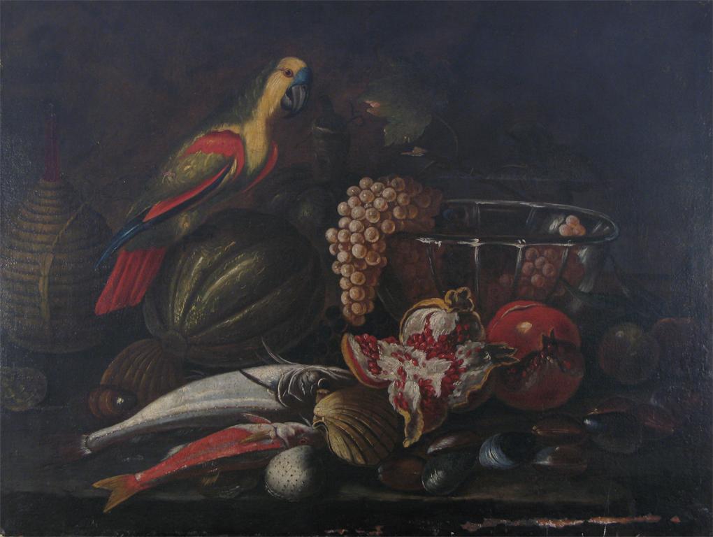 Follower of Jacob Bogdani A parrot perched on a melon near fruit and fish on a table Oil on...