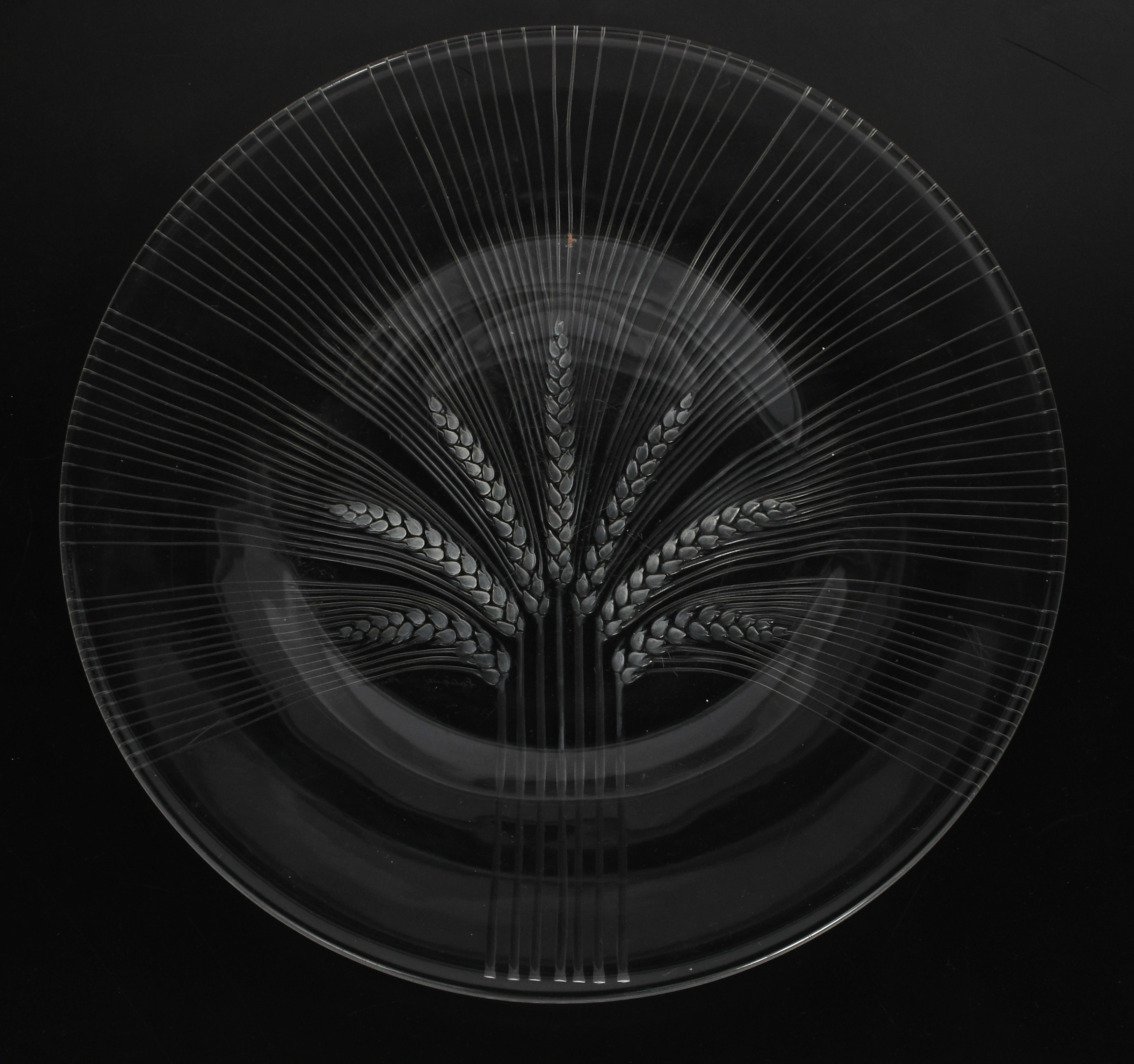 'Verneuill' model no.10-3055 a modern Lalique clear and frosted glass plate, originally designed by Rene Lalique, decorated with barley wheat stems, etched Lalique France, 32cm. diam.