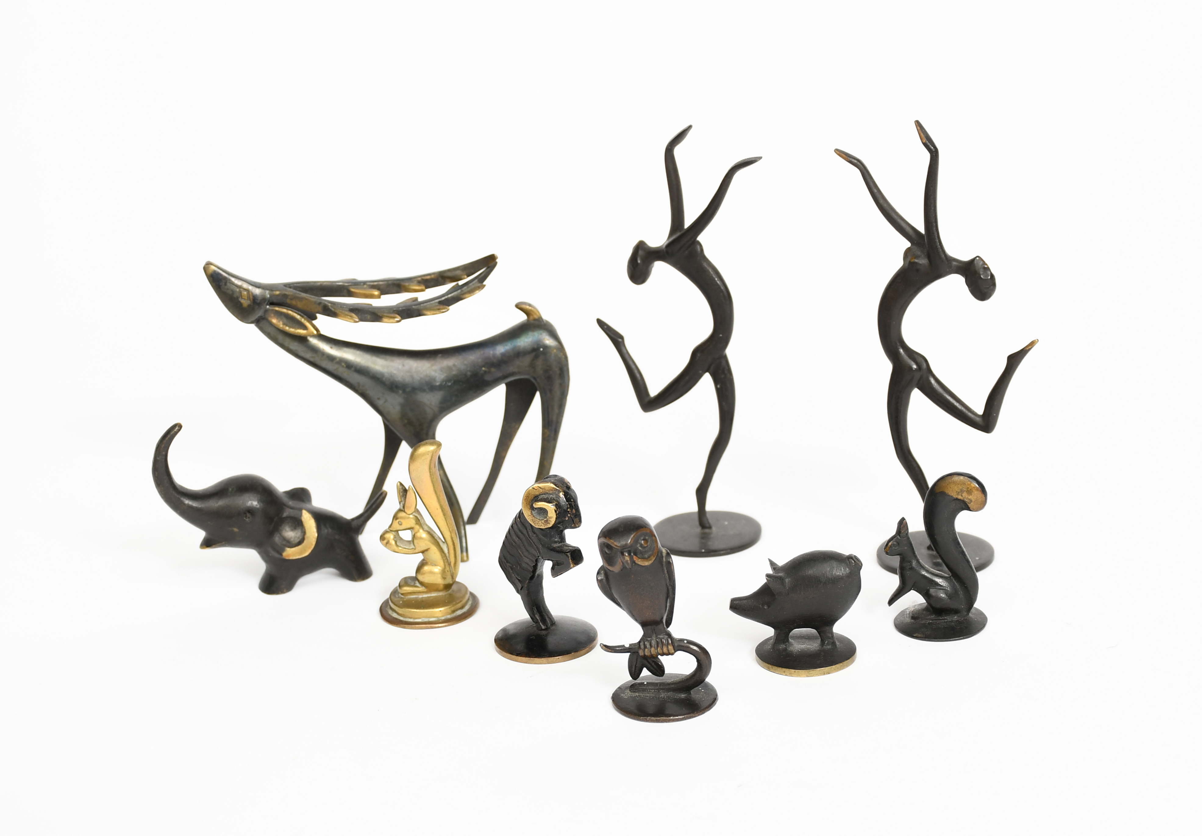 a patinated bronze model of a dancing figure, another similar, an owl perched on a bough and a squirrel all by Rena Rosenthal, and five other similar figures