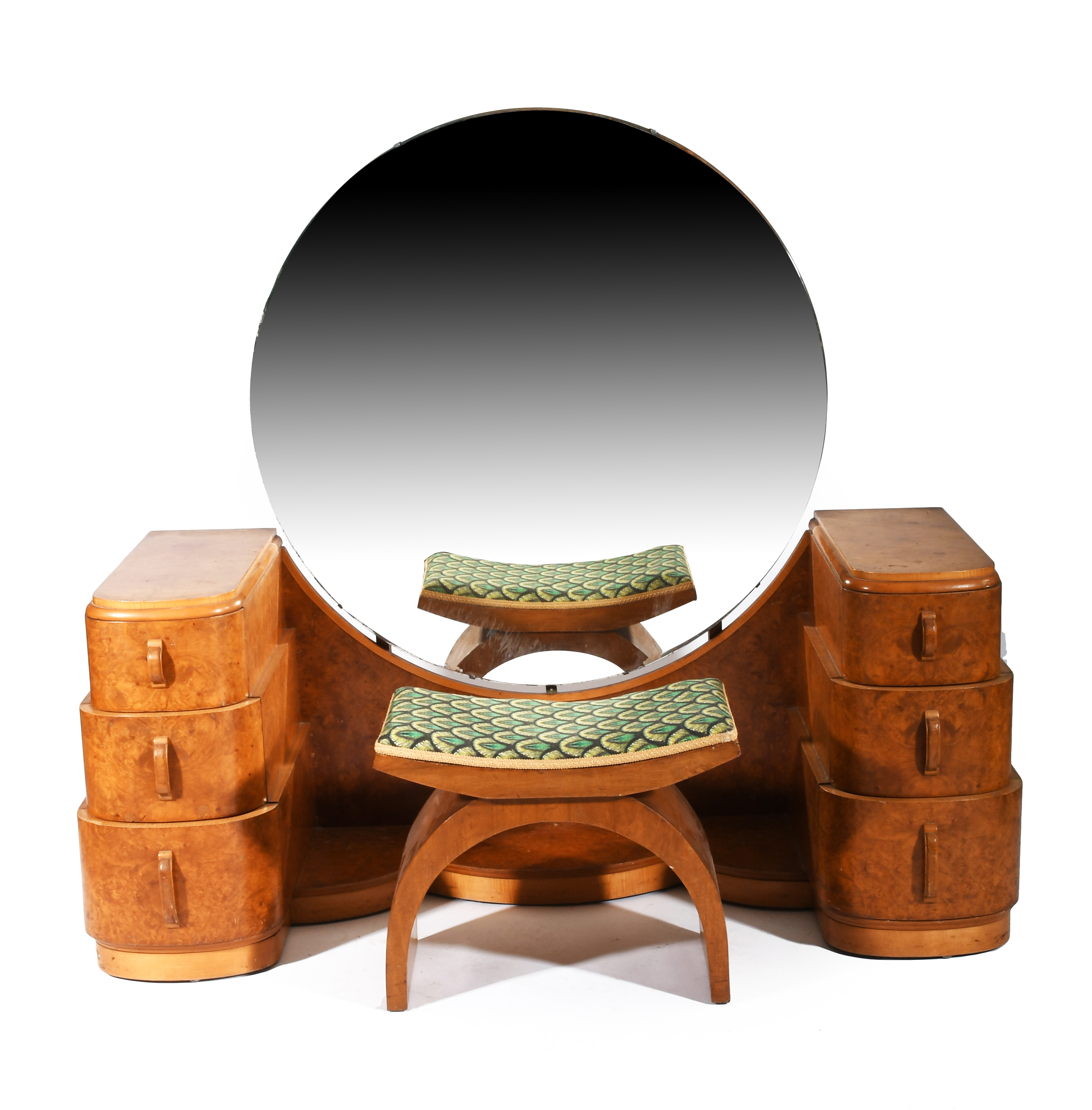 An Art Deco Birdseye maple dressing table probably Hille, two bands of graduated drawers flanking central large circular mirror, with ensuite stool, unsigned, 147cm. wide, 137cm high (approx) (2)