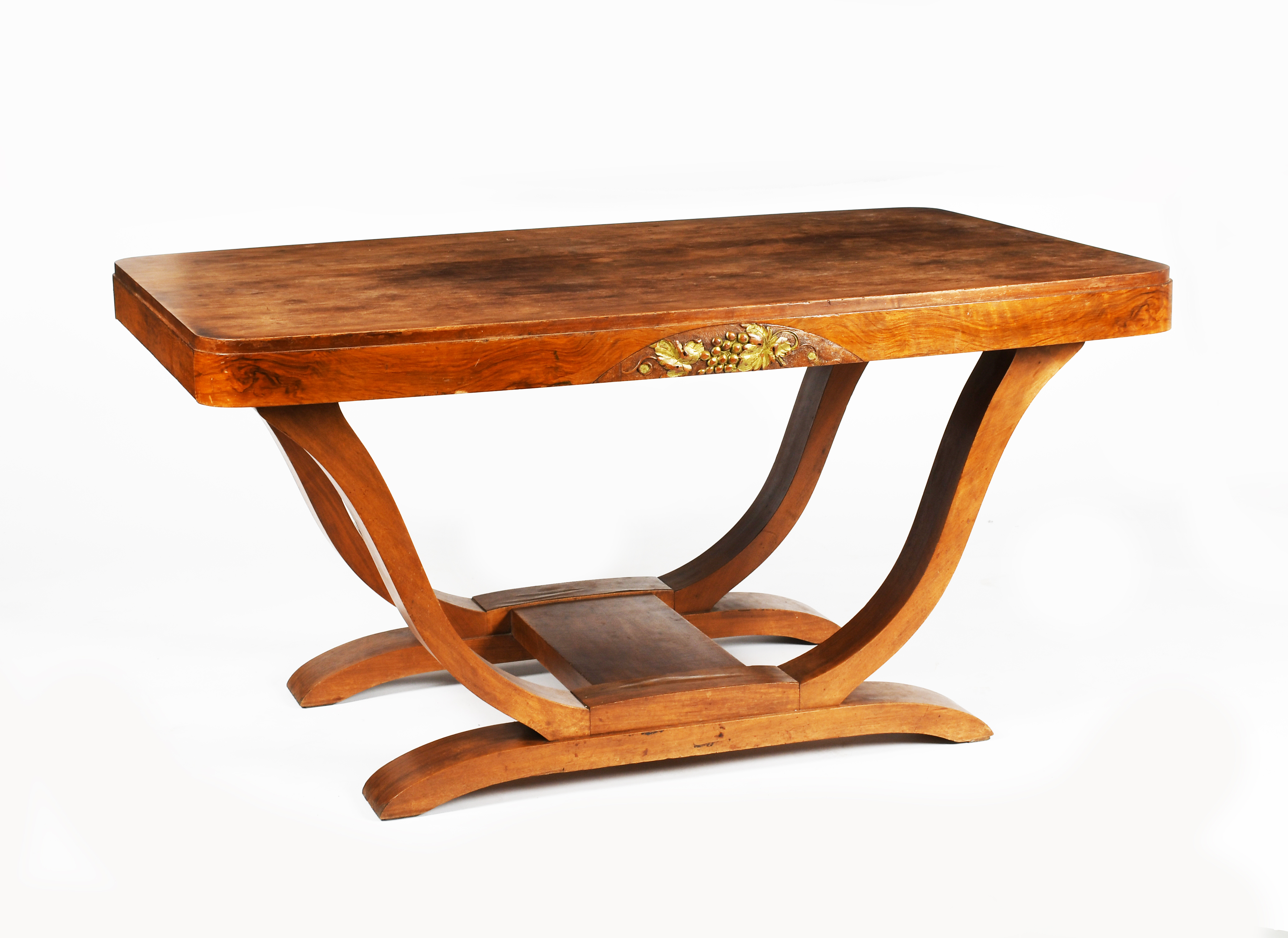 An Art Deco extending dining table, rectangular top with applied gesso panels to the sides, and six