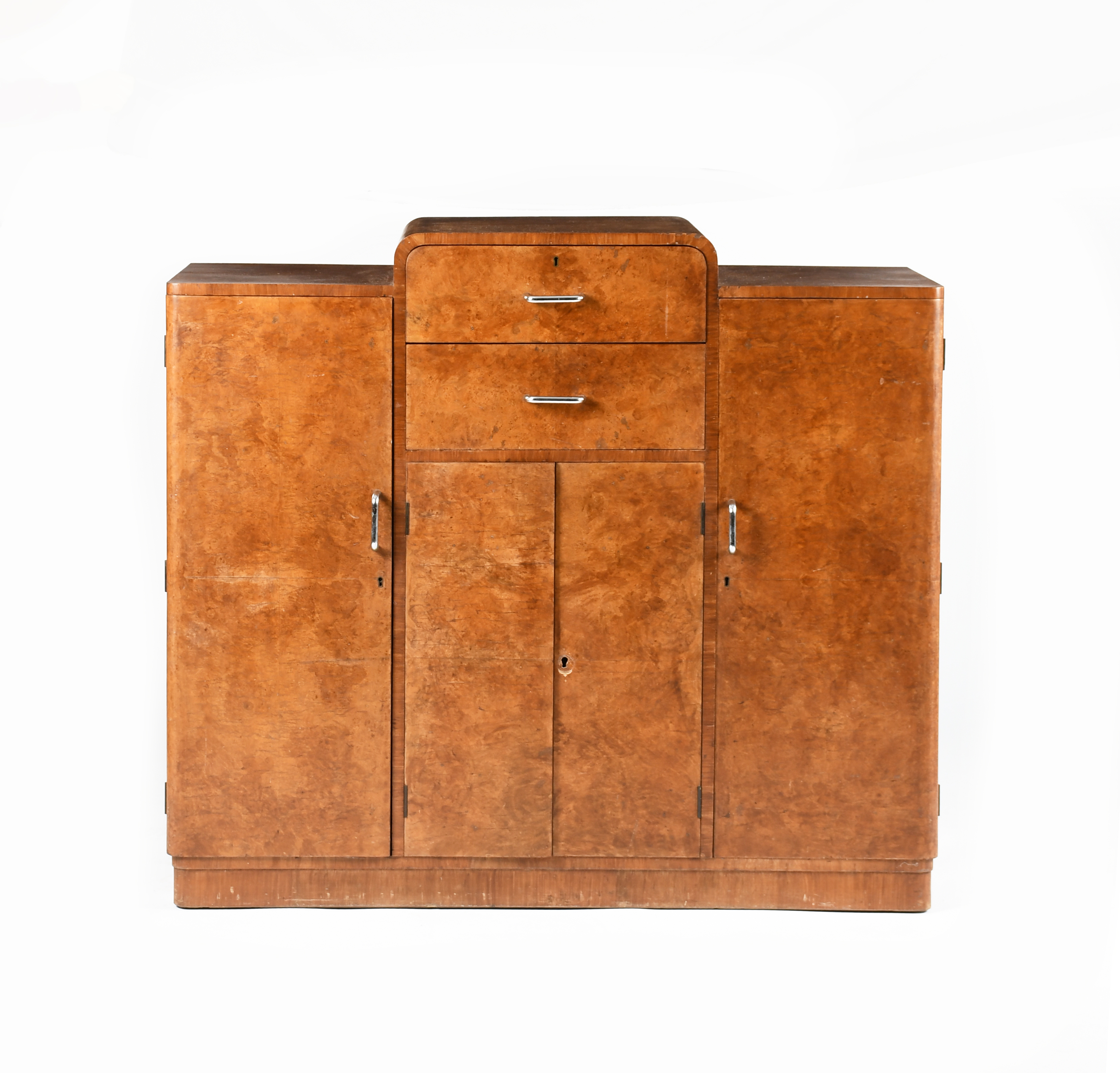 An English Art Deco walnut veneer cabinet, stepped form, two central cupboards below two drawers, flanked by two larger cupboards, chrome furniture, unsigned, 121cm. wide, 109cm. high