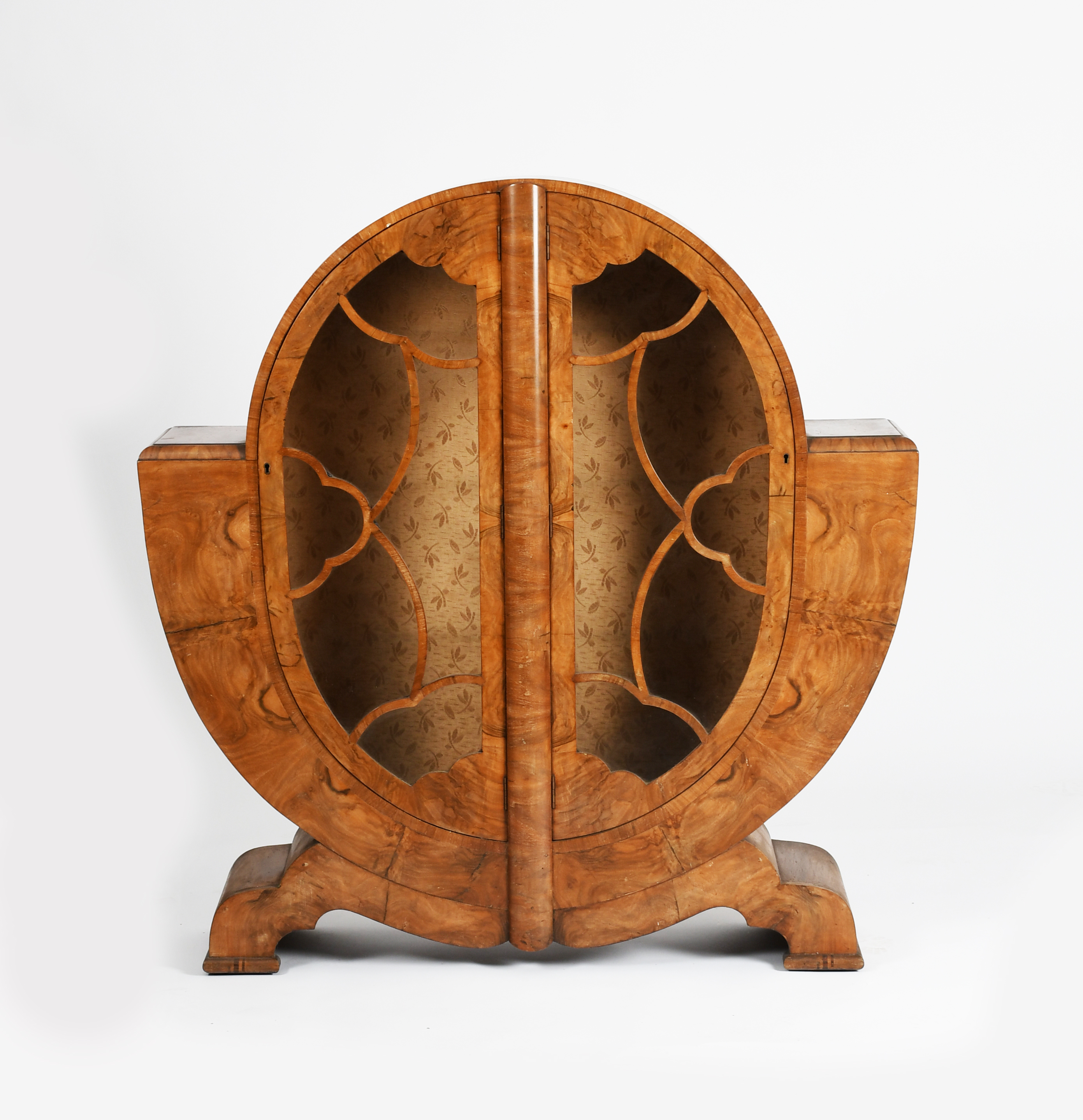 An Art Deco walnut veneer display cabinet, oval form with two hinged glass doors, unsigned, 58cm