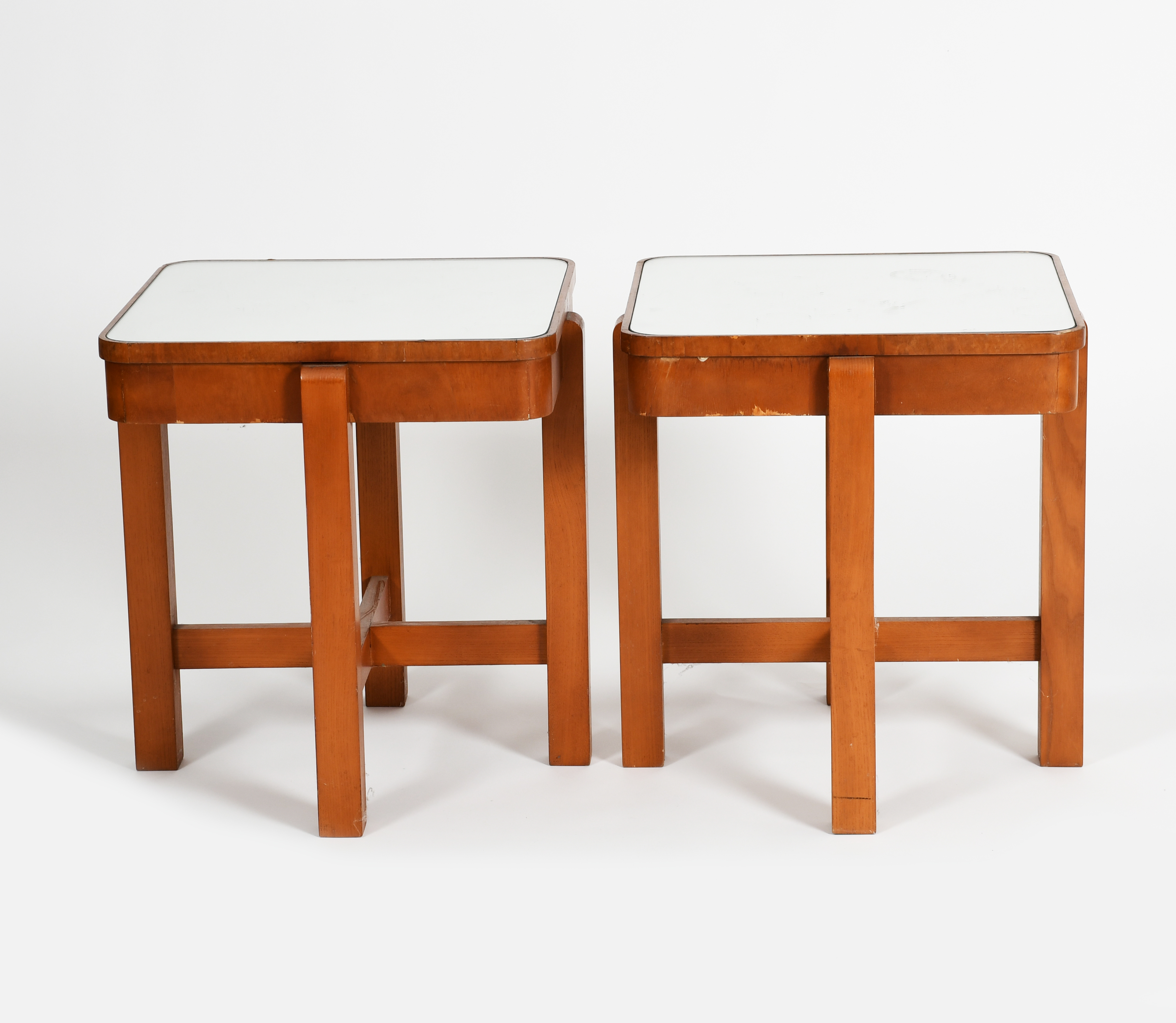 A pair of Art Deco mirror topped side tables, rounded square section, unsigned, 46cm square (2)