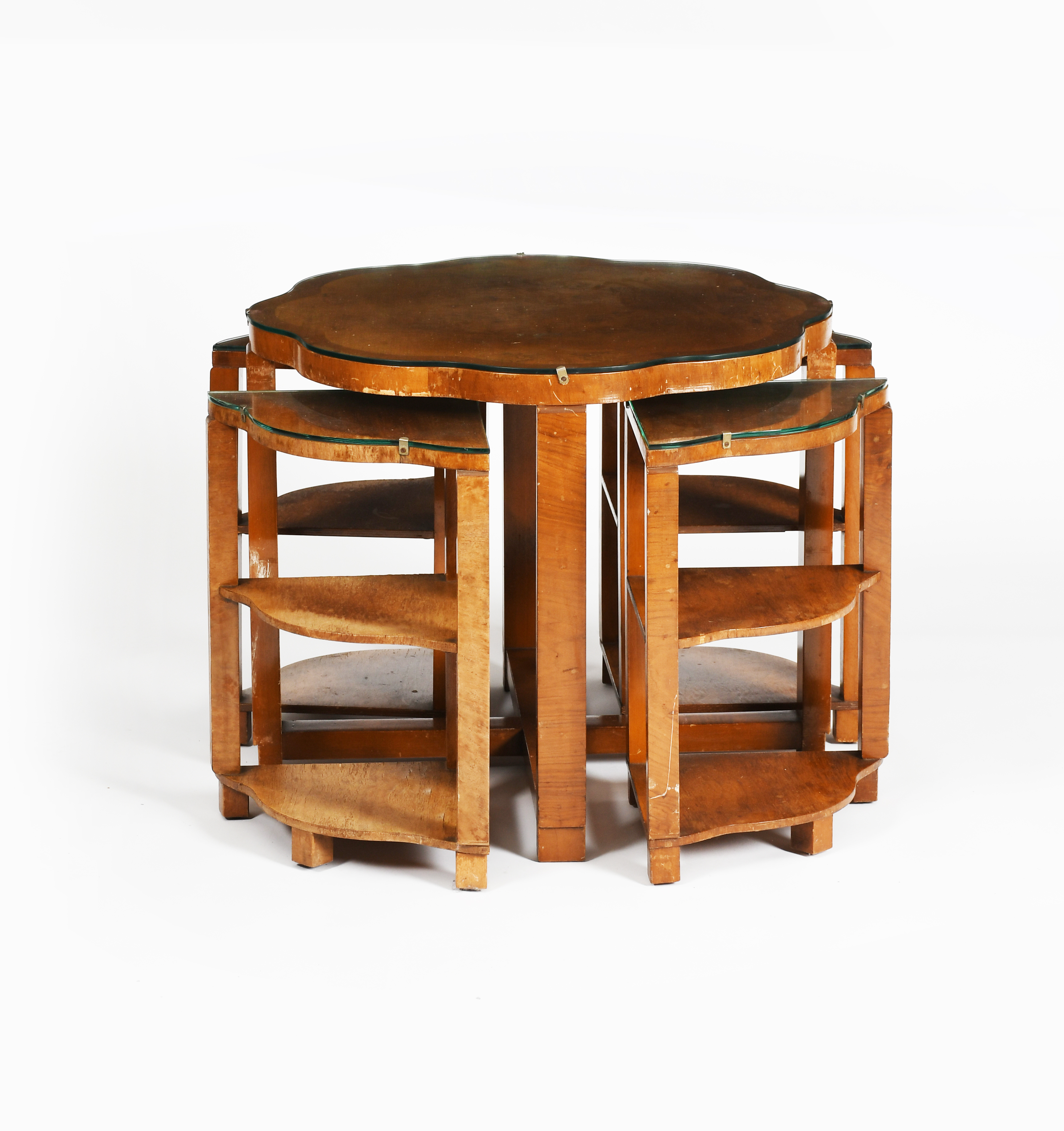 An Art Deco burr walnut nest of tables, shaped round section with four quarter tables, glass top,