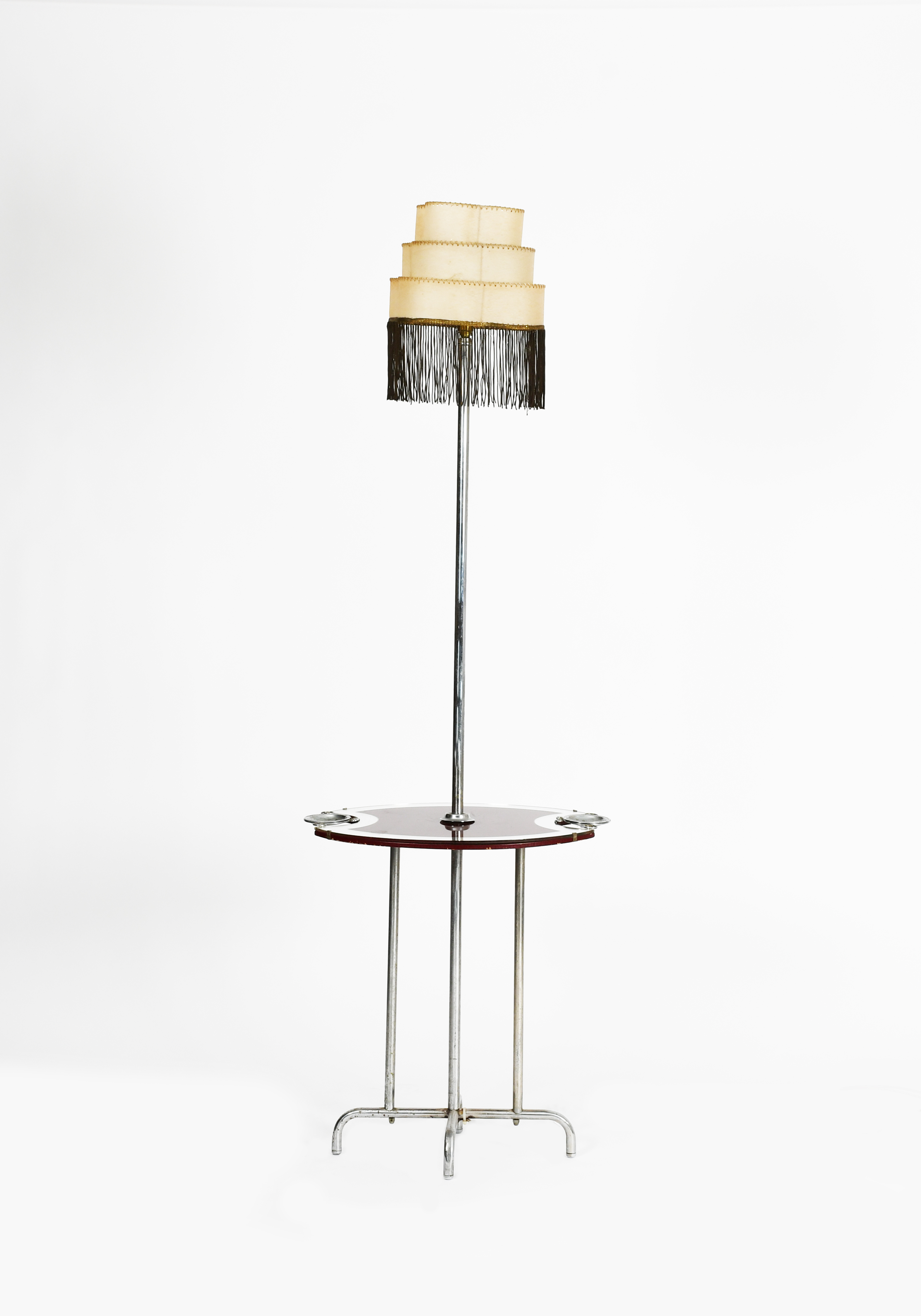 An Art Deco chrome tray table and floor light, the oval tray with two circular ashtrays, unsigned, 176cm. high