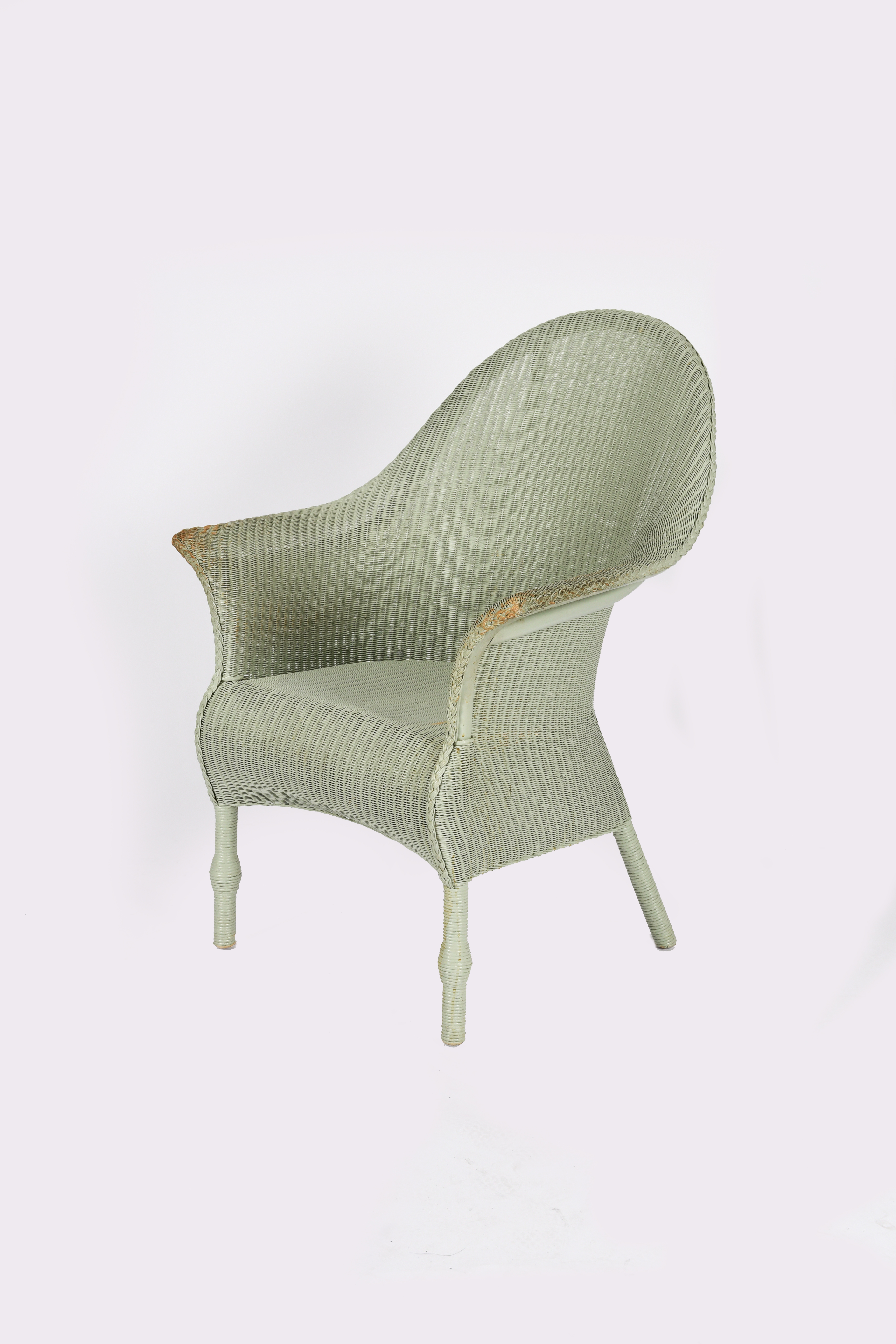 A William Lusty Lloyd Loom armchair, sprayed mint green, another armchair and side table sprayed