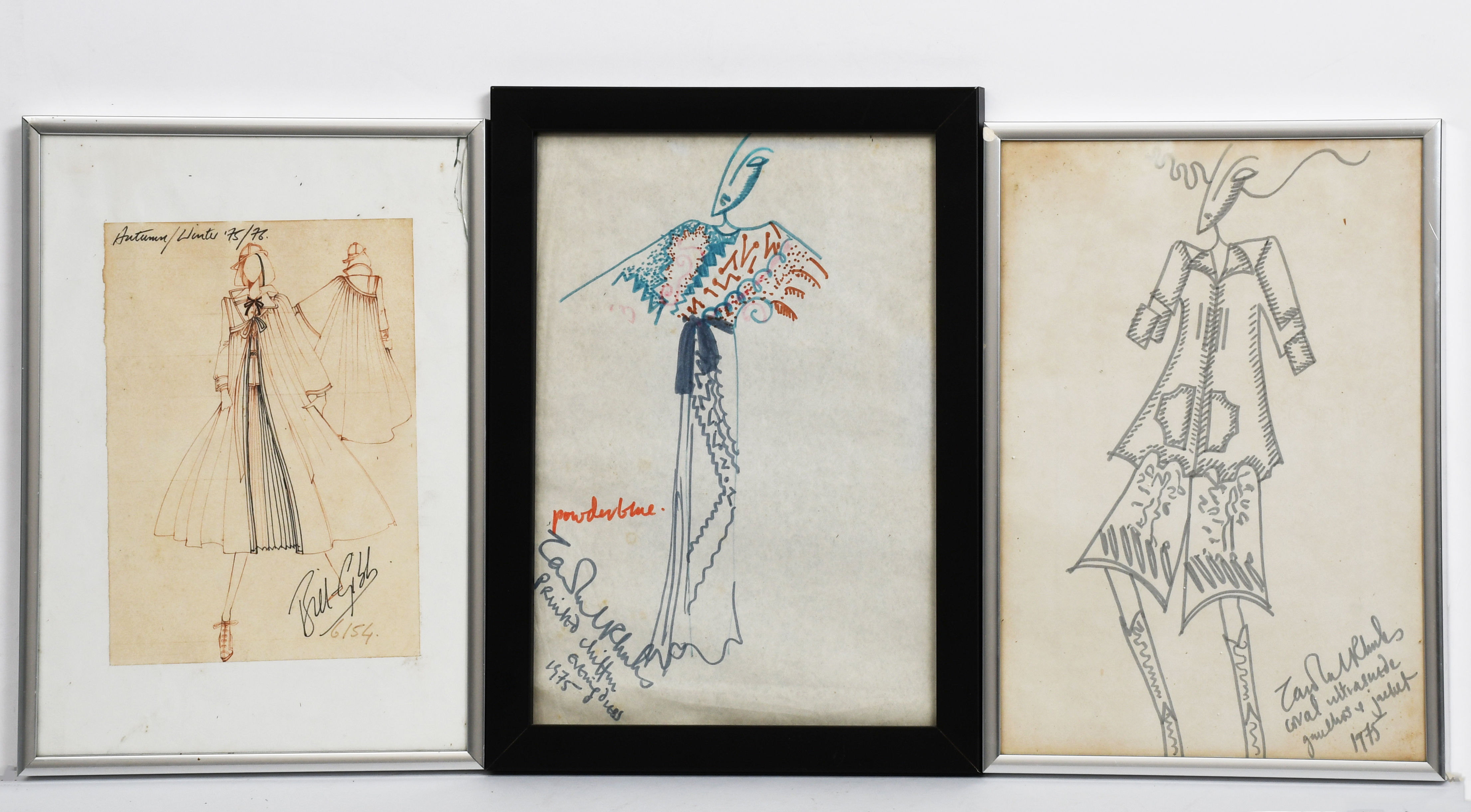 an original costume design, another titled Coral ultrasuede gauchos and jacket, 1975, and a dress design by Bill Gibb, dated 1975-76 Autumn-Winter, framed