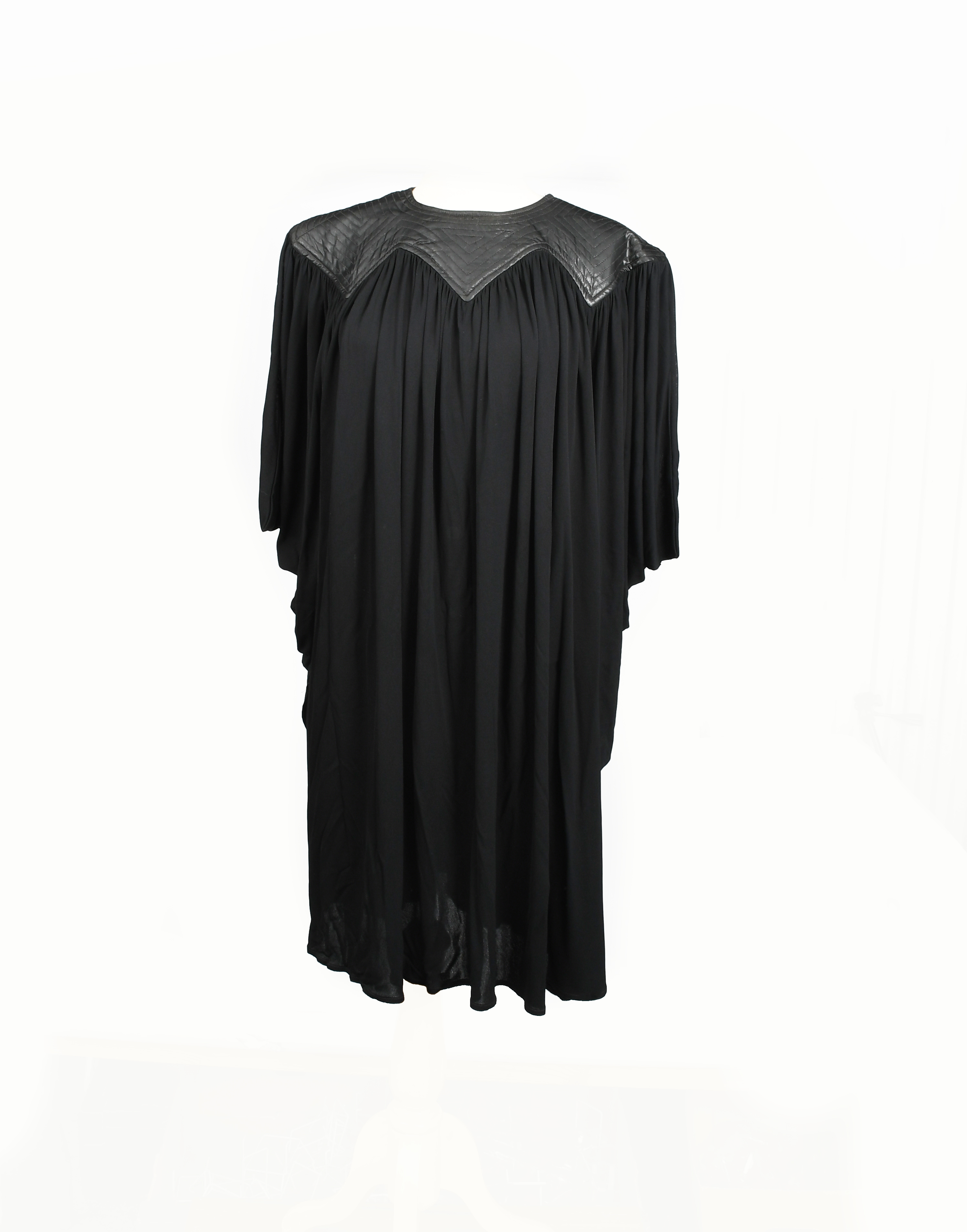 Black leather dress coat, a black smock dress by Yuki and a jacket by Bill Gibb