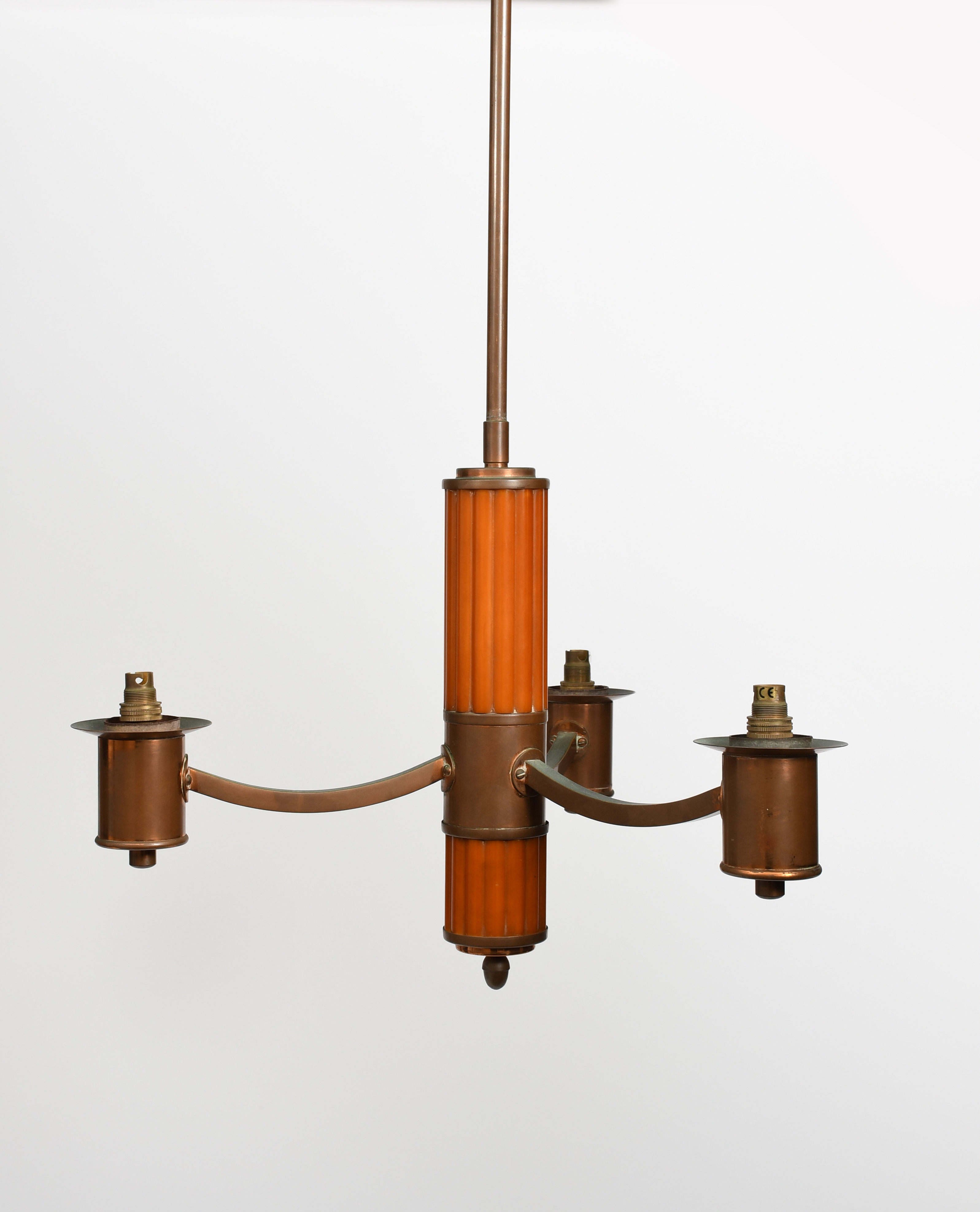 An Art Deco bakelite and copper three light electric ceiling light, the tapering, fluted bakelite