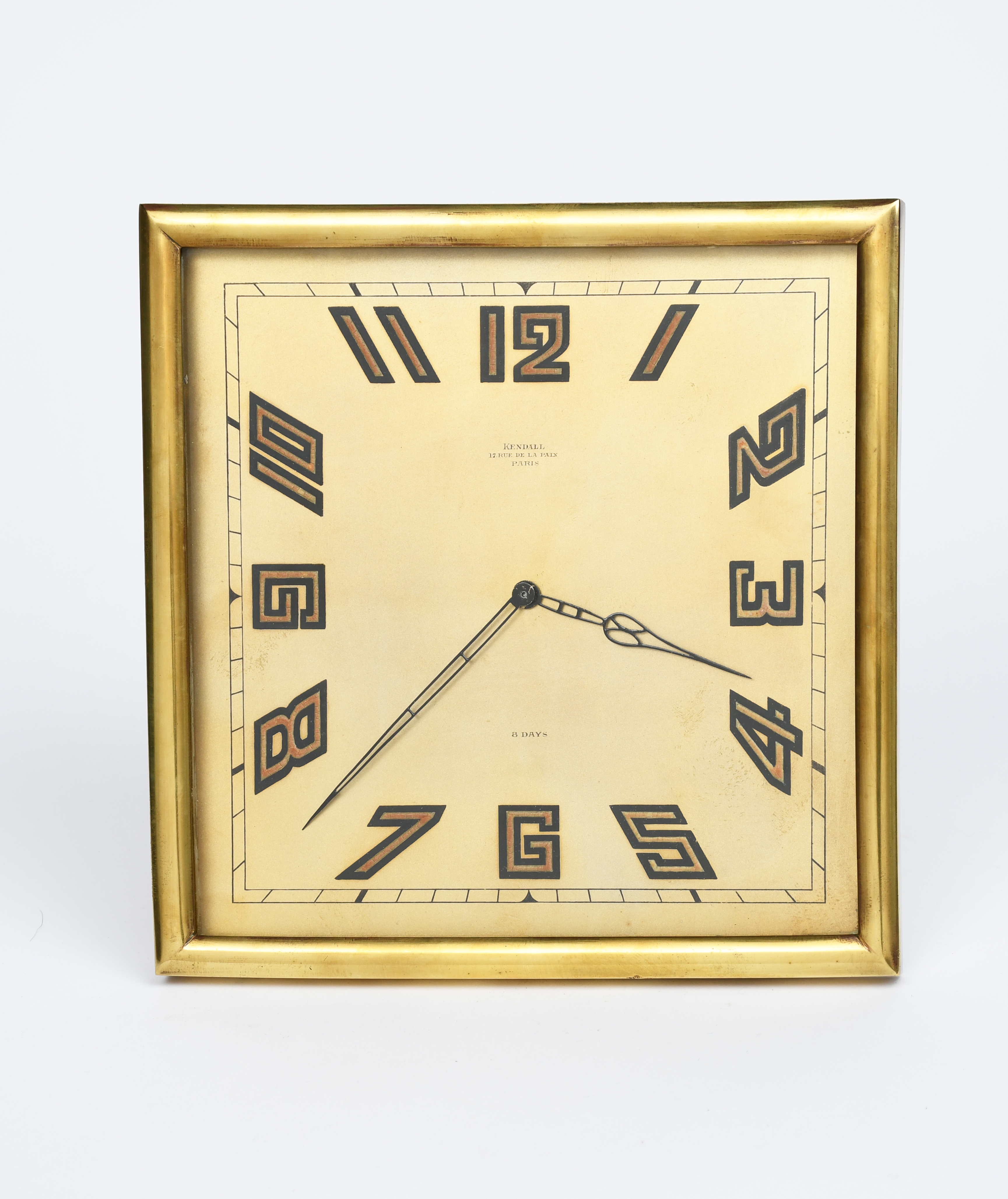 A large Kendall Paris eight day desk clock, brass frame with easel back, Kendall Paris to dial, 24cm. square