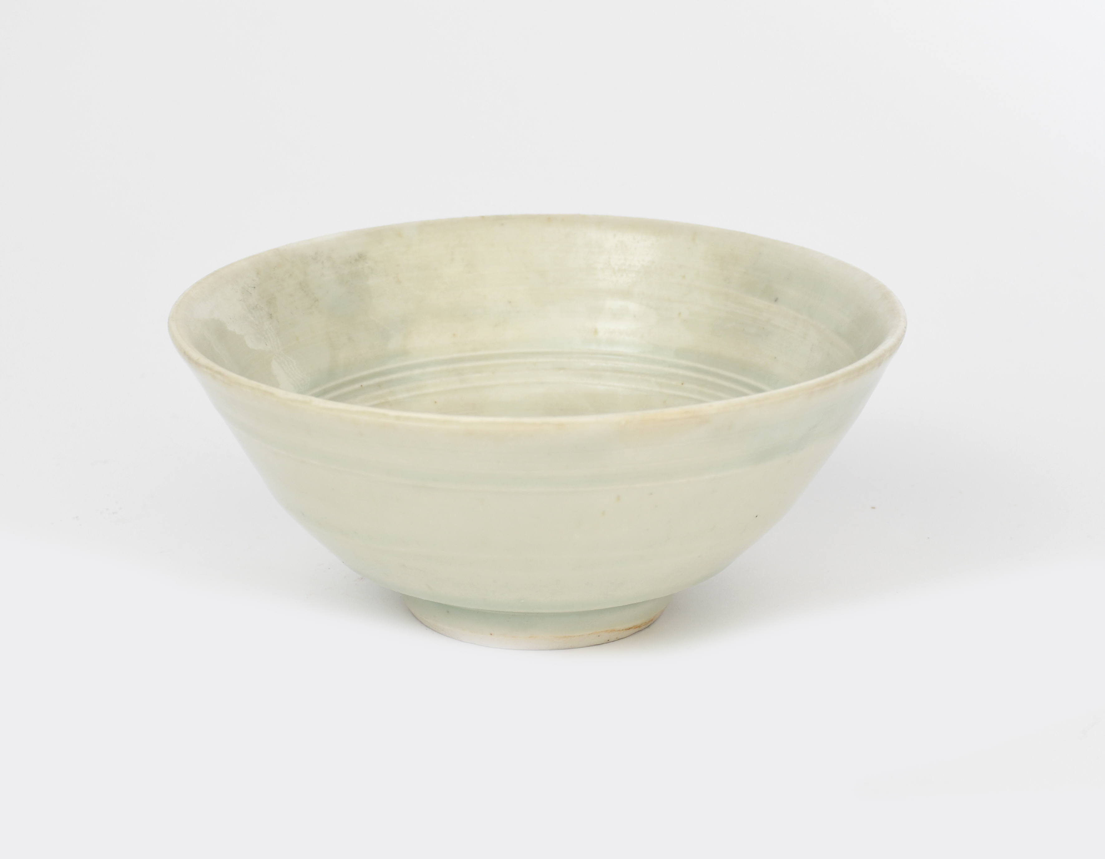 a porcelain bowl with incised bands to interior, covered to the foot with a pale blue ash glaze,