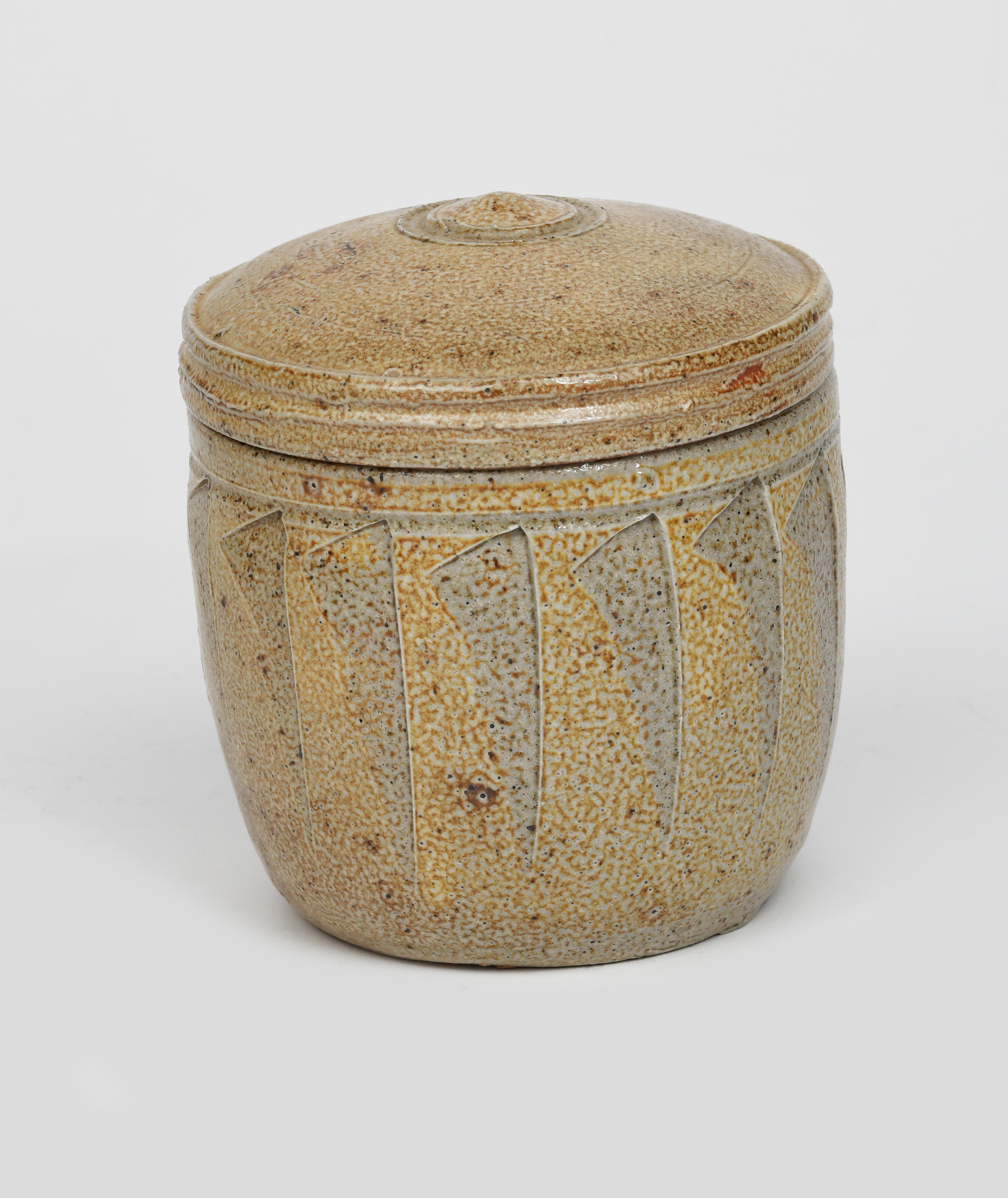 a cut-sided stoneware caddy and cover, glazed to the foot with ash