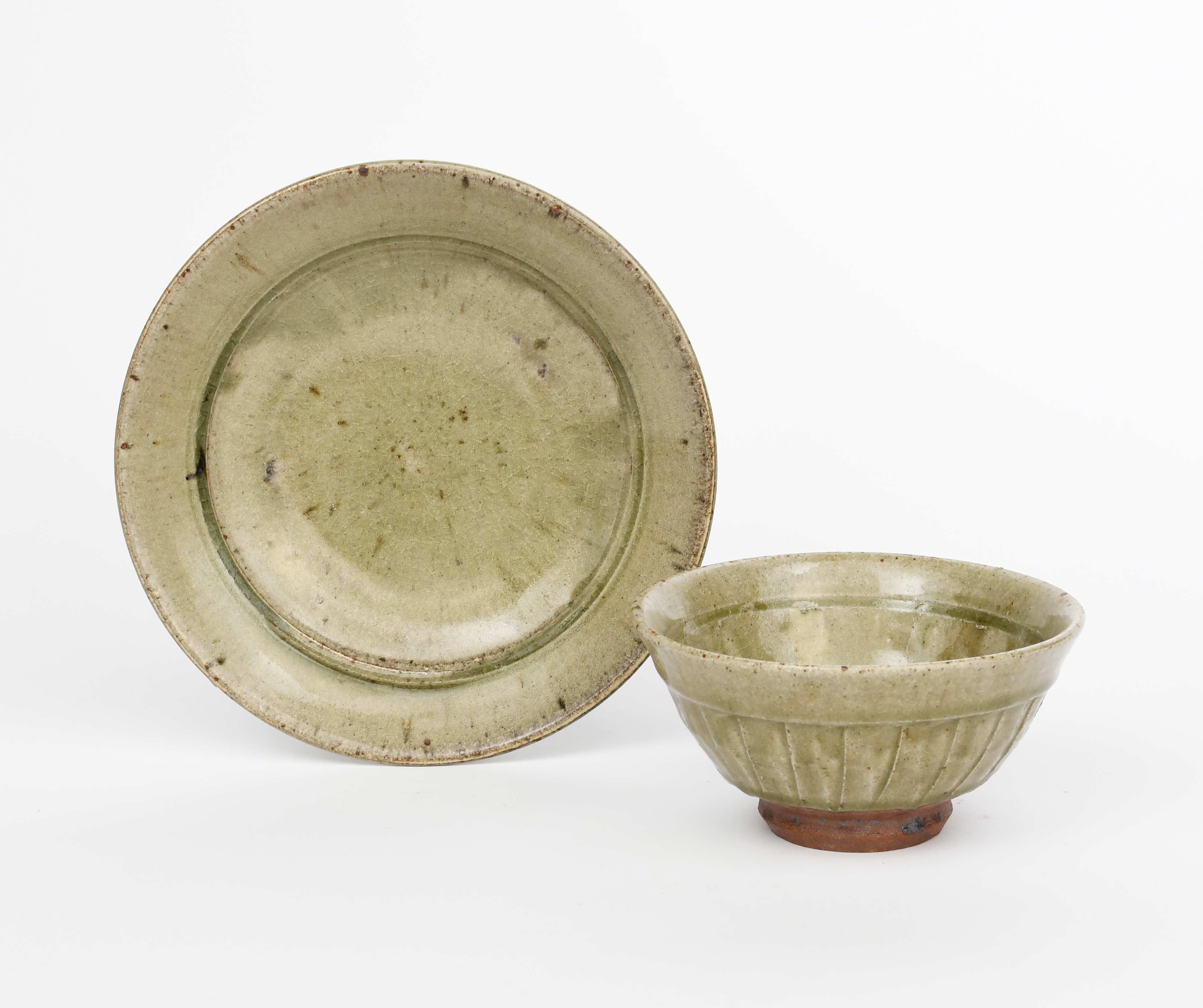 a stoneware cut-sided open bowl, covered to the foot with an ash glaze, and a stoneware supper dish by Richard Batterham