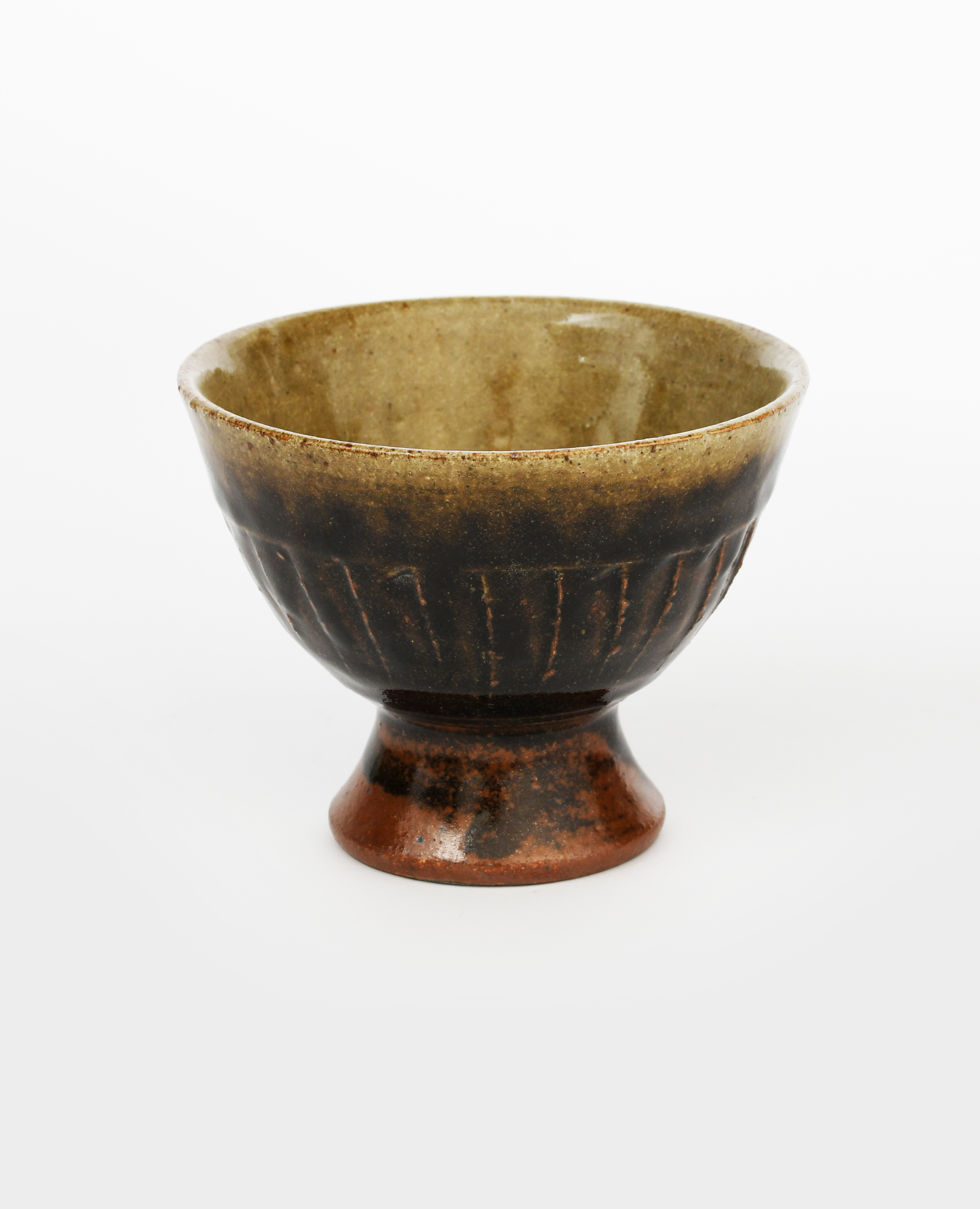 a cut-sided stoneware tazza, internally decorated with ash, the exterior dark iron glaze