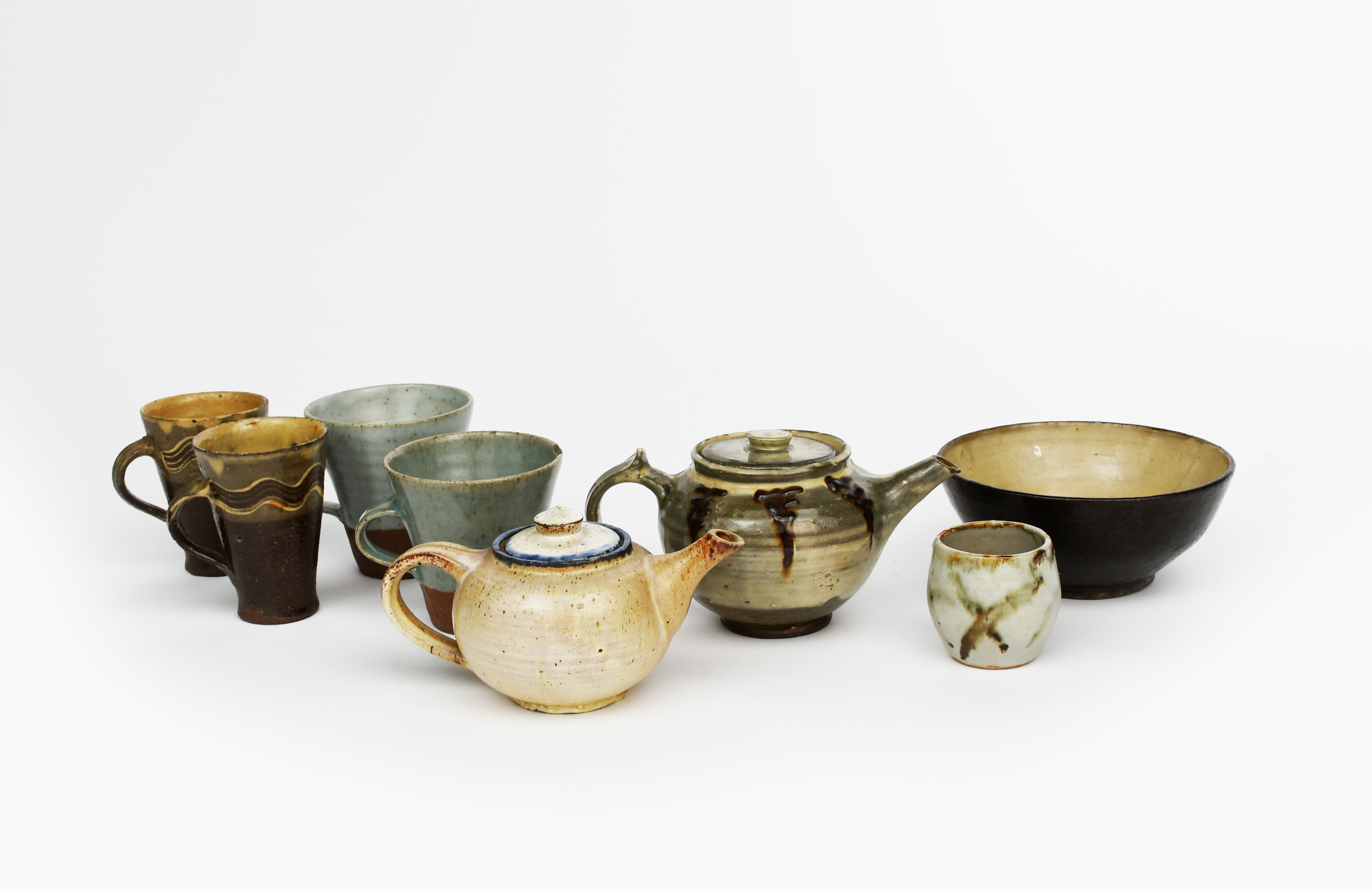 an early pottery teapot and cover, probably made at Bryanston, slip decorated on a blue-grey ground, another smaller teapot and cover dated 1950, and a collection of early pottery by Richard Batterham,