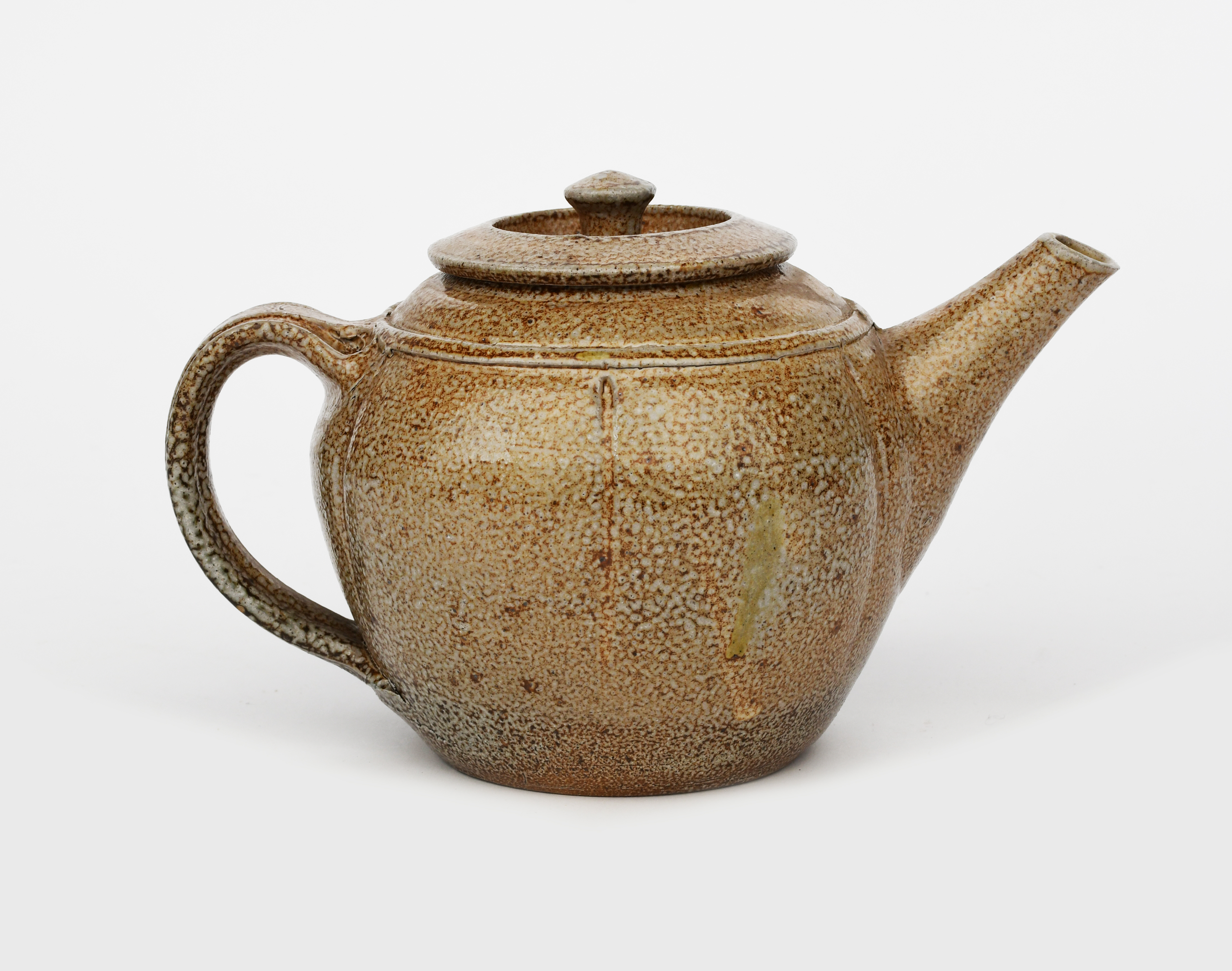 a salt-glaze stoneware Melon teapot and cover, covered to the foot with ash glaze