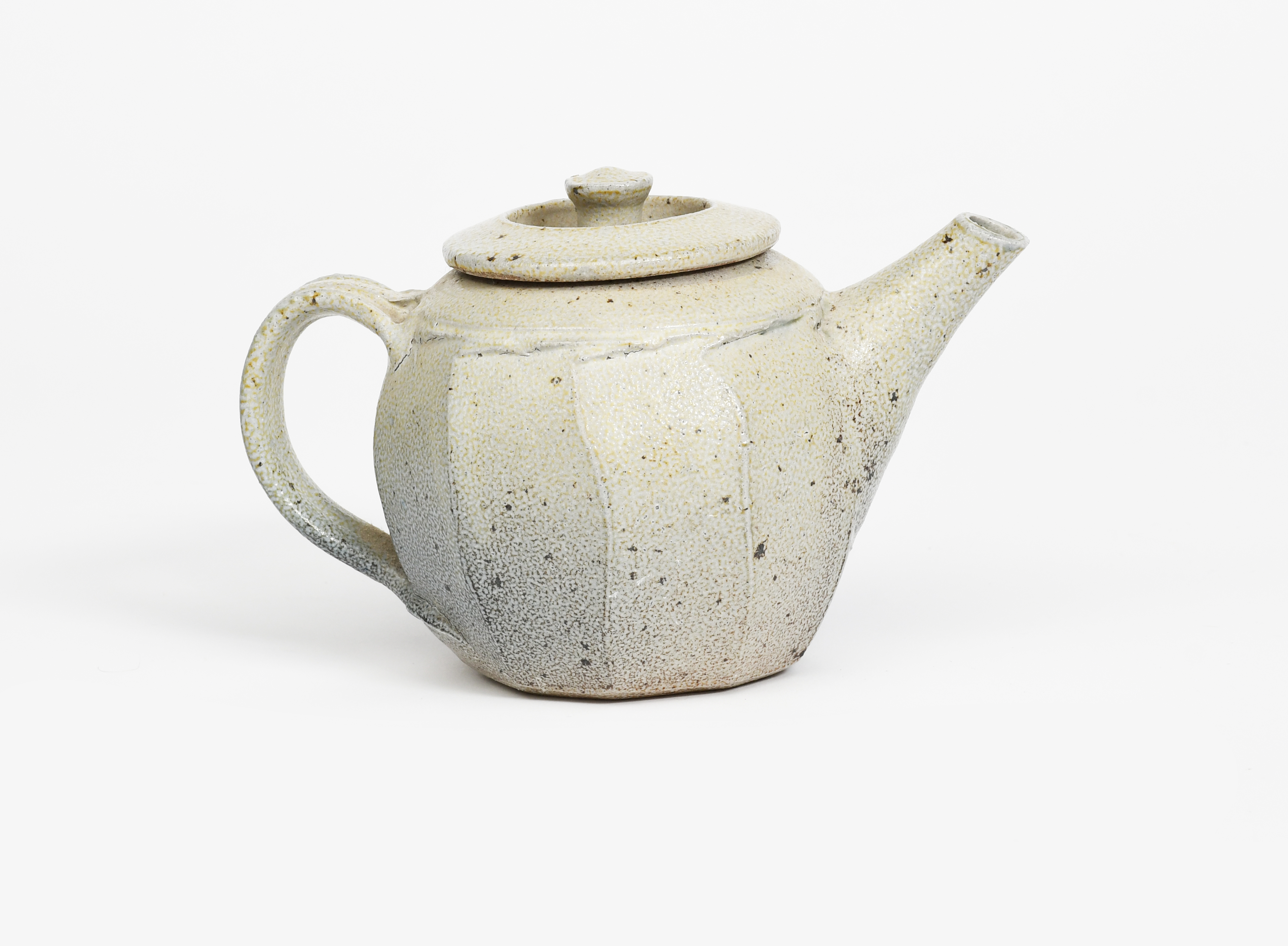 a salt-glaze stoneware cut-sided teapot and cover, covered in a pale blue-grey glaze with drips,