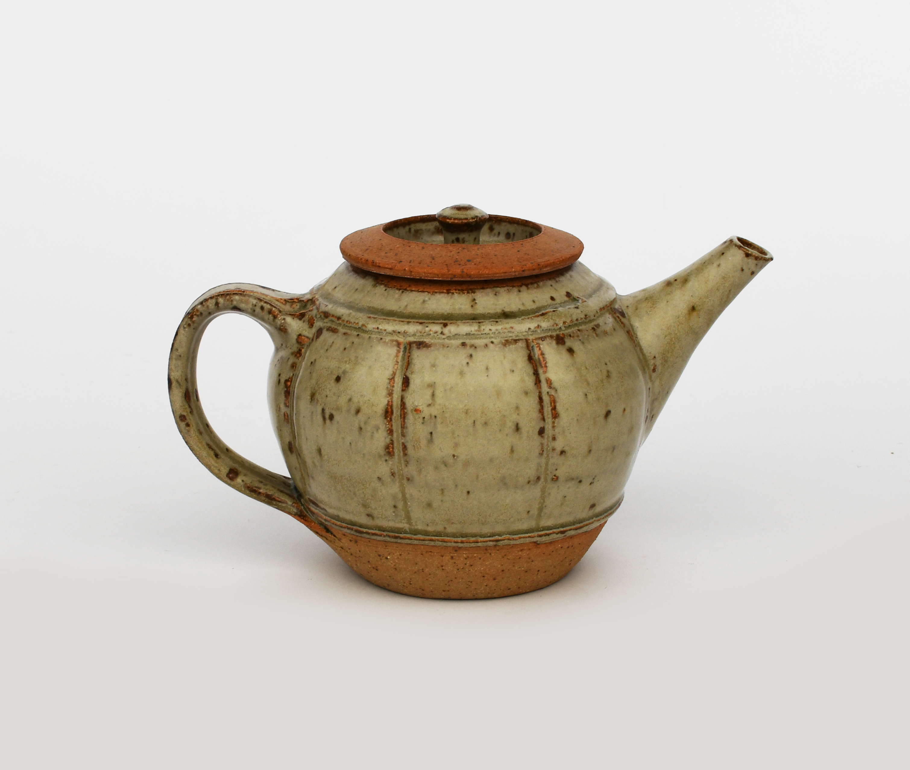 a salt-glaze stoneware Melon teapot and cover, covered to the base with a speckled ash glaze