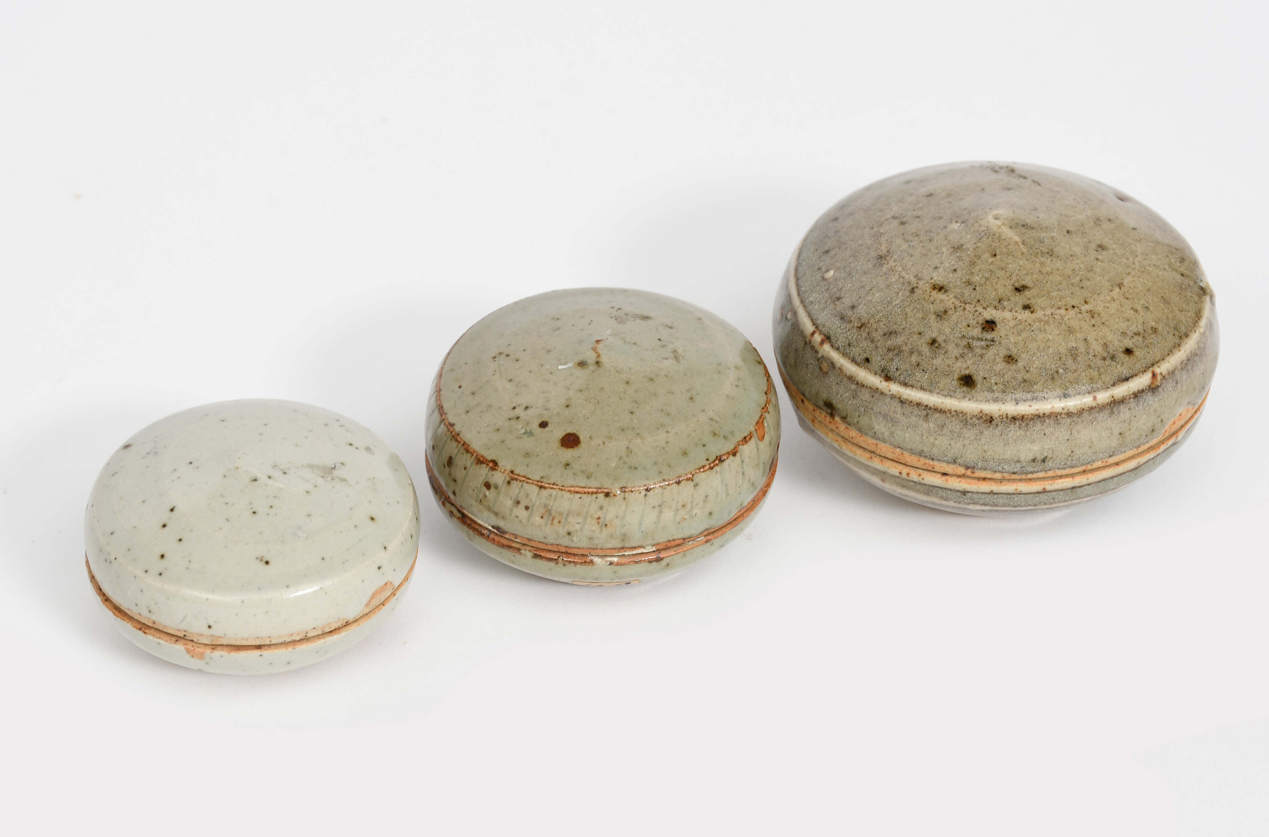 a small stoneware box and cover, circular, covered in a speckled ash glaze, and two smaller stoneware box and covers by Richard Batterham
