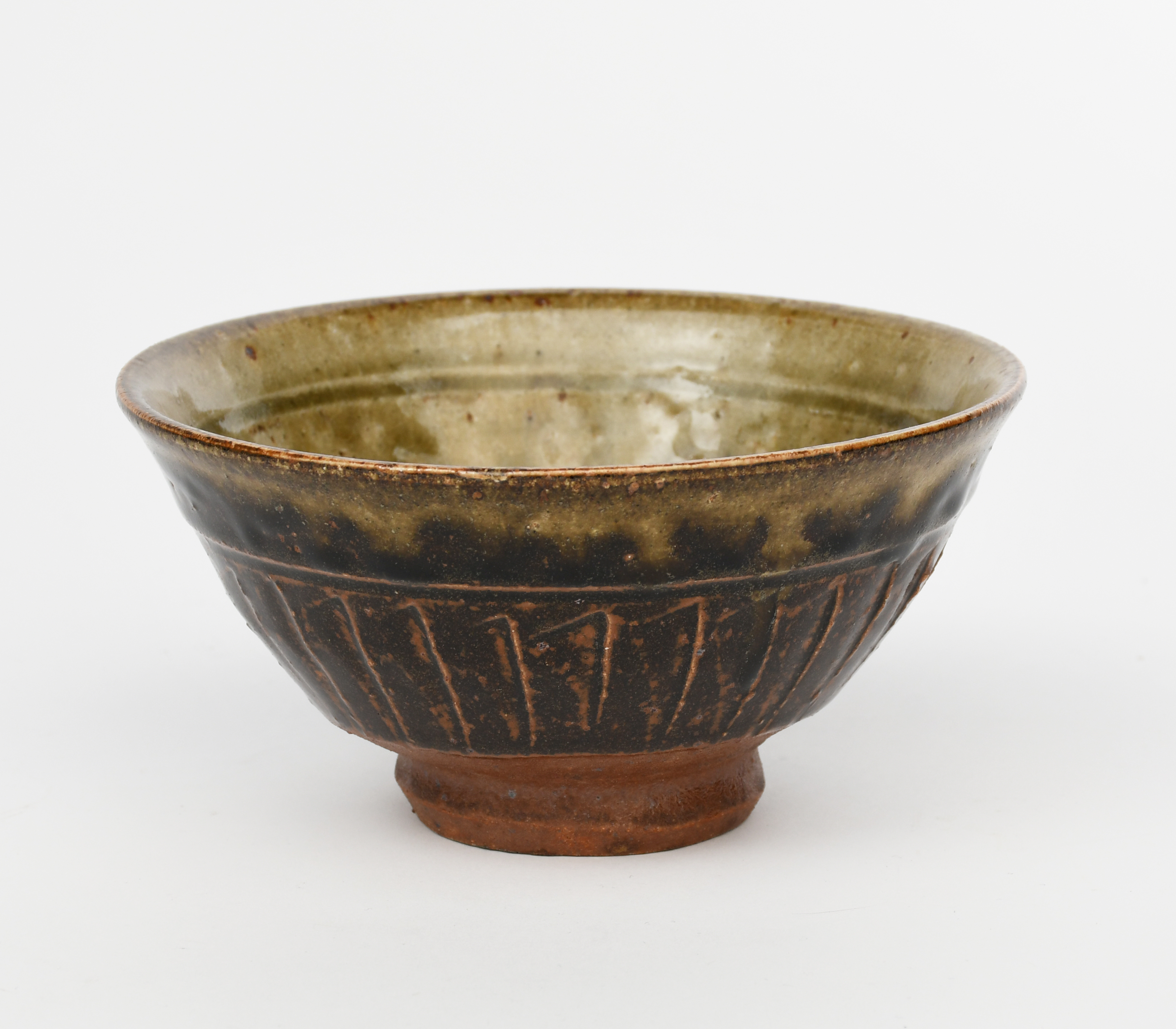 a stoneware small fluted open bowl, glazed to the interior ash, the exterior black iron,
