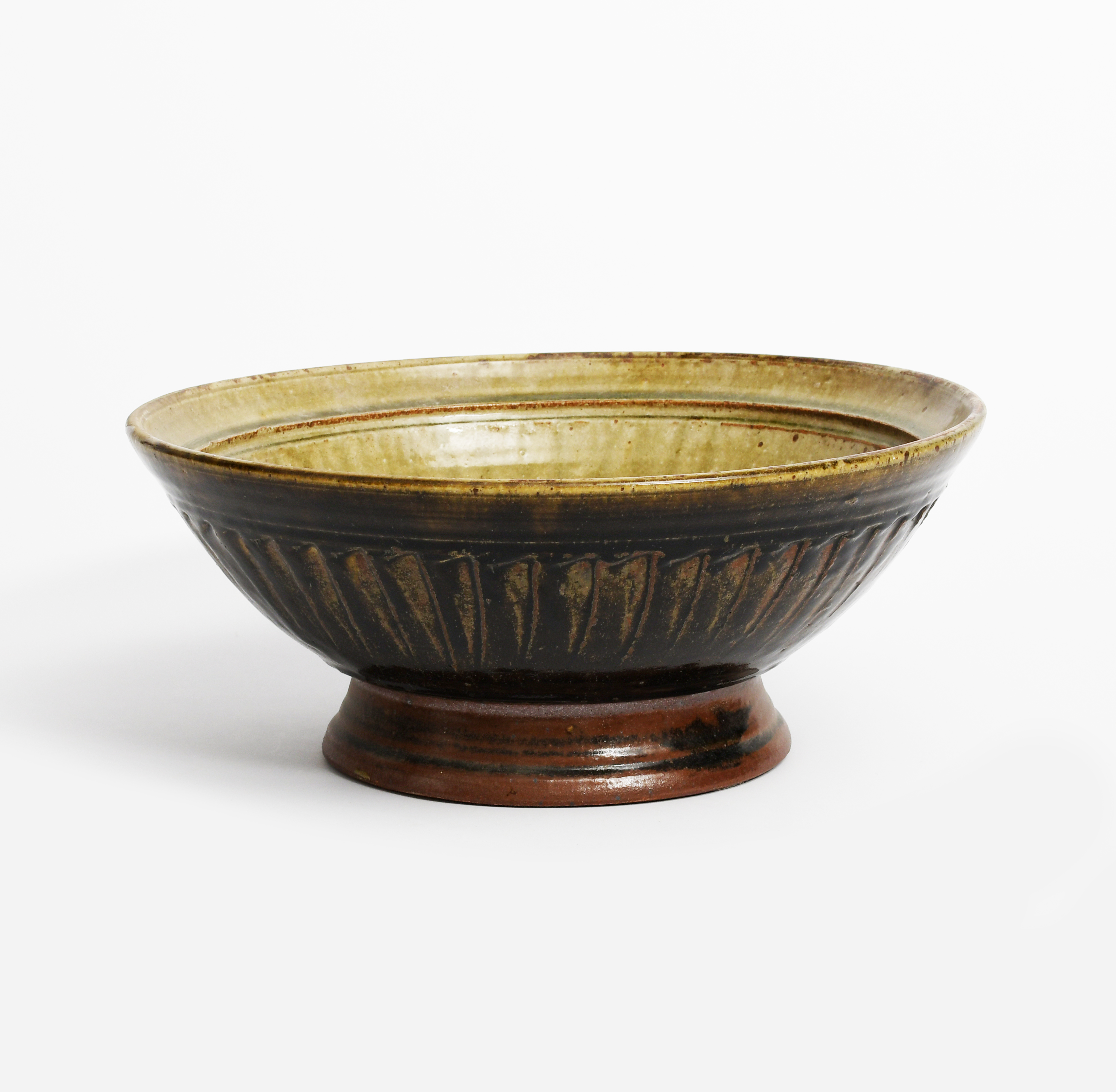 a large cut-sided stoneware tazza, glazed ash to interior, the exterior black iron,