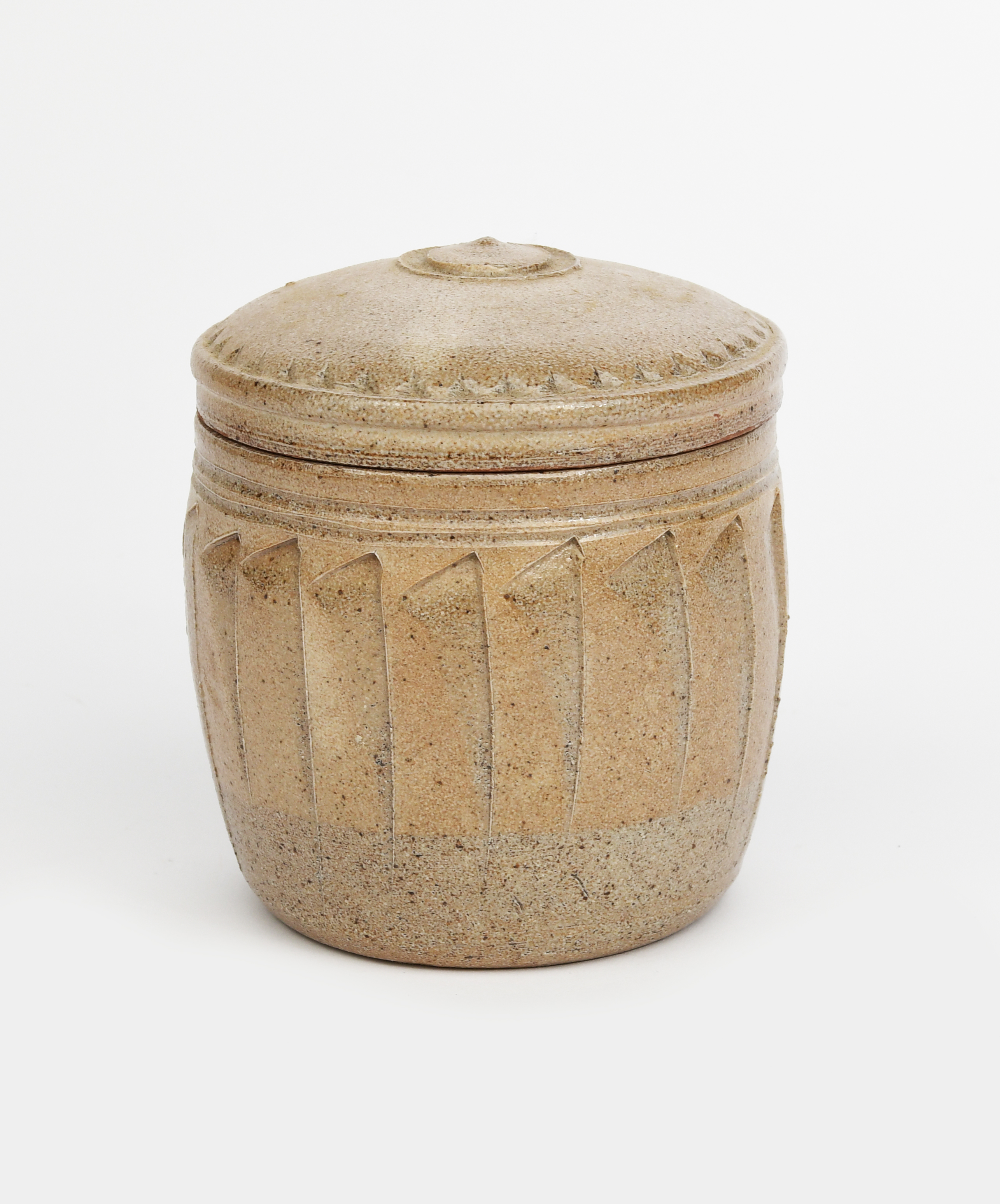 a salt-glaze cut-sided stoneware tea caddy and cover, the cover with chatter band to the rim, glazed ash to interior,