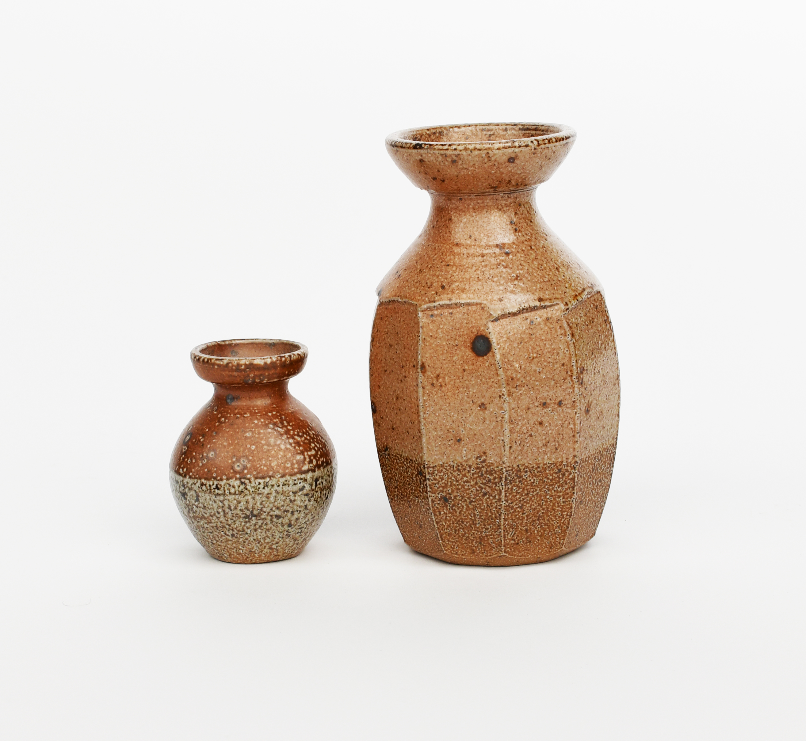 a salt-glaze cut-sided stoneware flower bottle, and another smaller by Richard Batterham