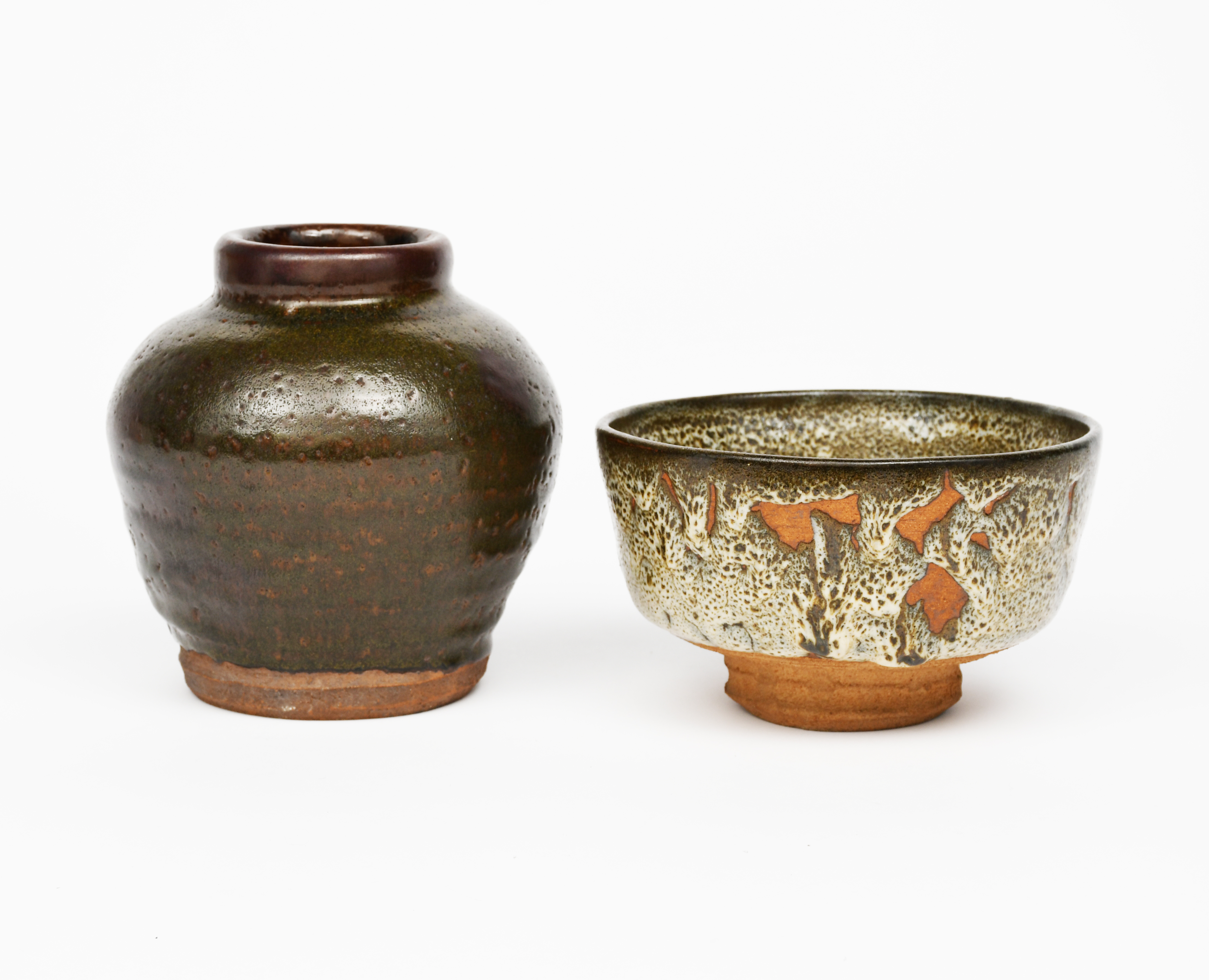 a stoneware footed bowl, covered to the foot with a running mushroom and white speckled glaze, and a stoneware vase by William Staite Murray covered in a rust glaze to the foot