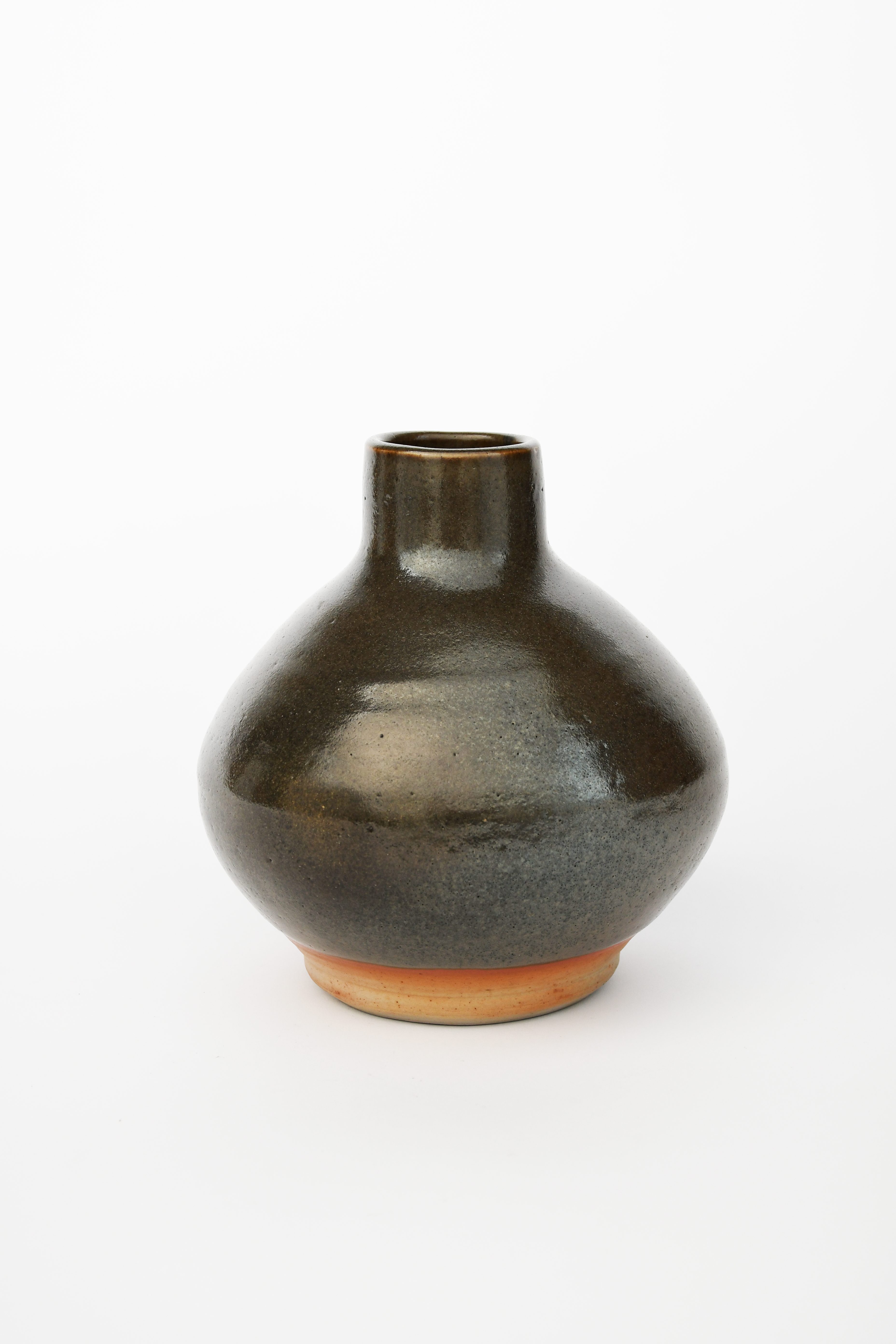 a Leach Pottery stoneware vase, ovoid with short, collar rim, covered to the foot with a pitted olive green, impressed seal marks, 18.5cm high