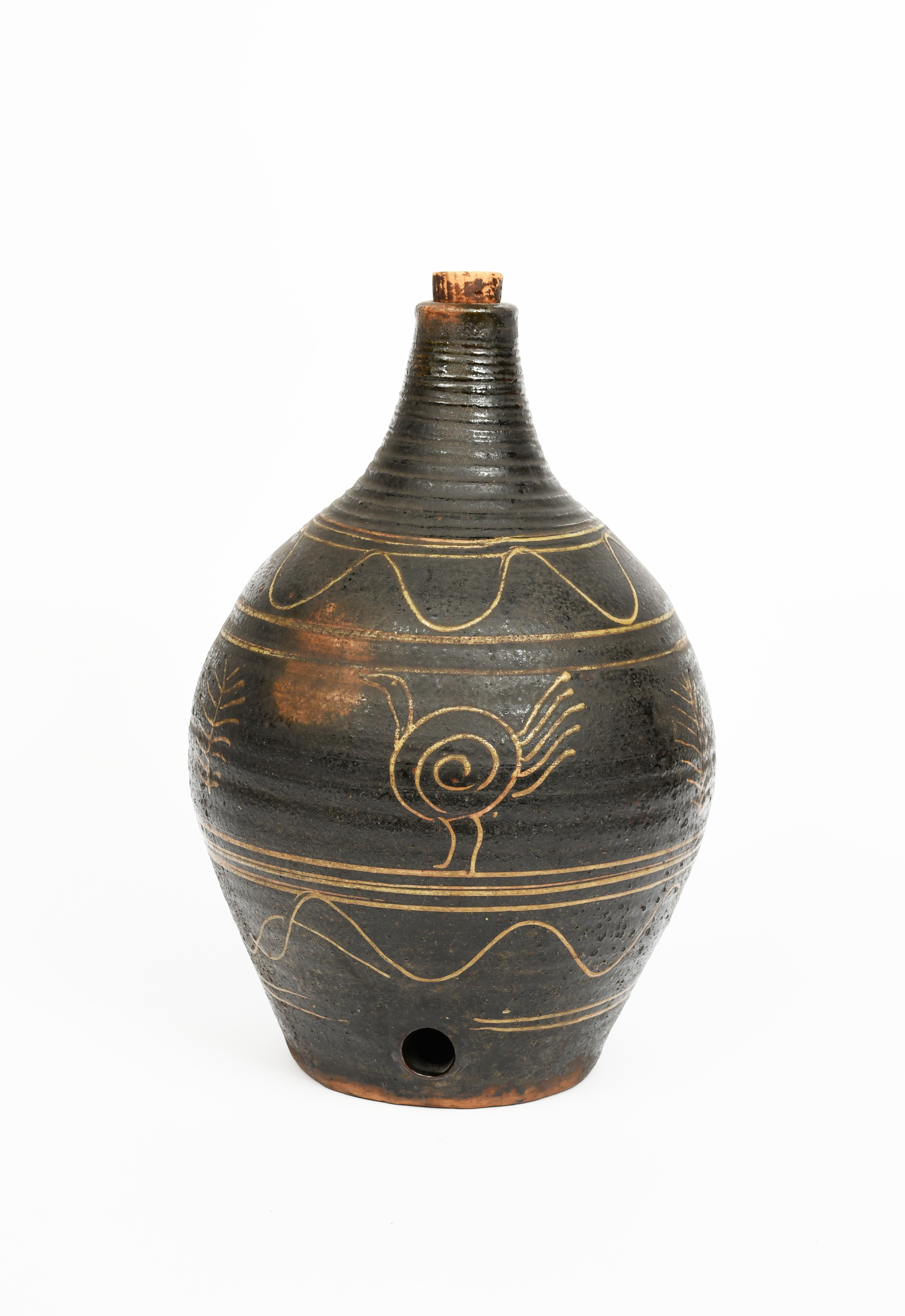 a Winchcombe Pottery slip-decorated earthenware cider jar, slip decorated with a stylised bird between leaf motif, in sand-yellow on an umber ground,