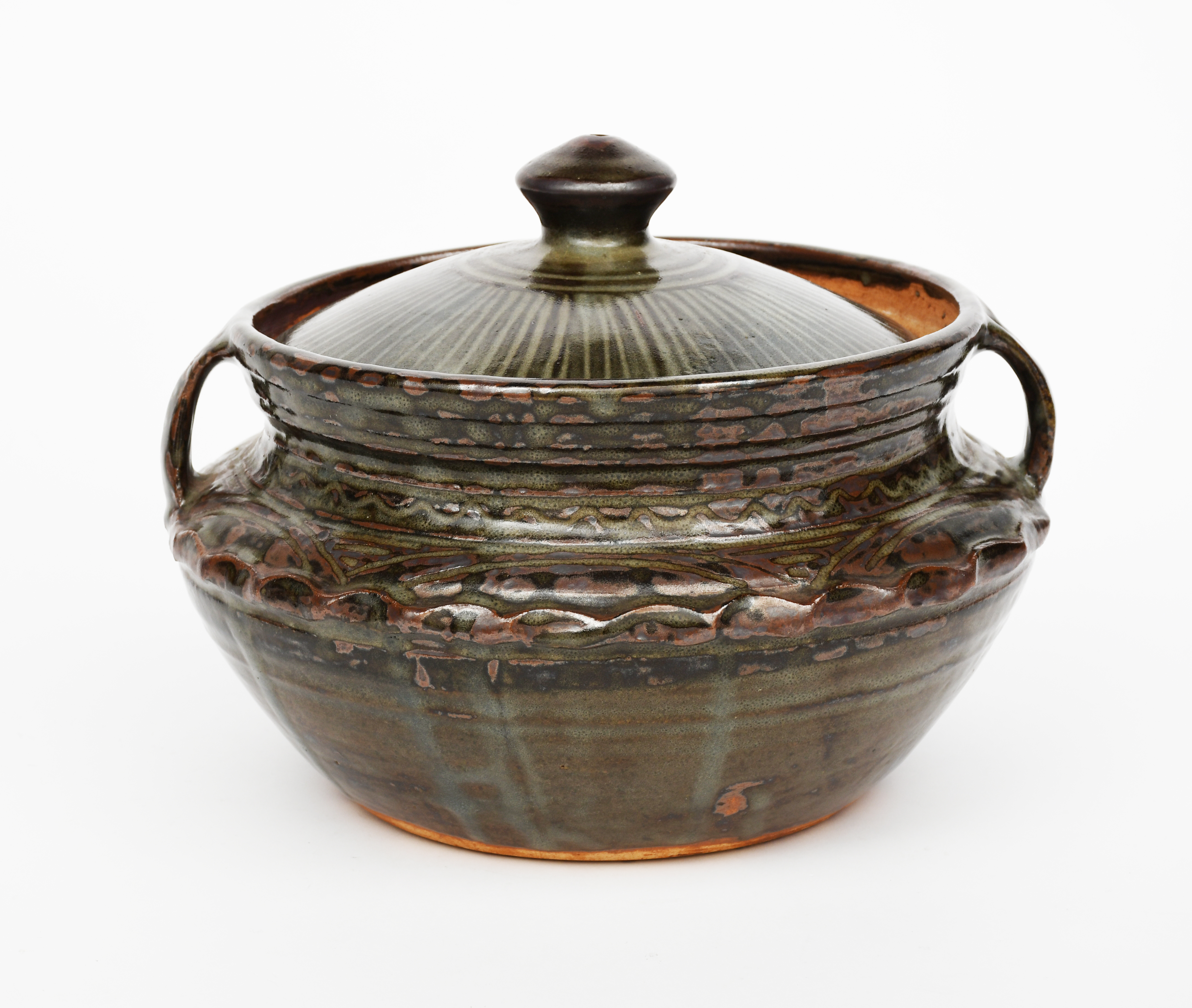 a Wenford Bridge stoneware Gwari casserole and cover, twin-handled form with pie-crust band, glazed in ochre,