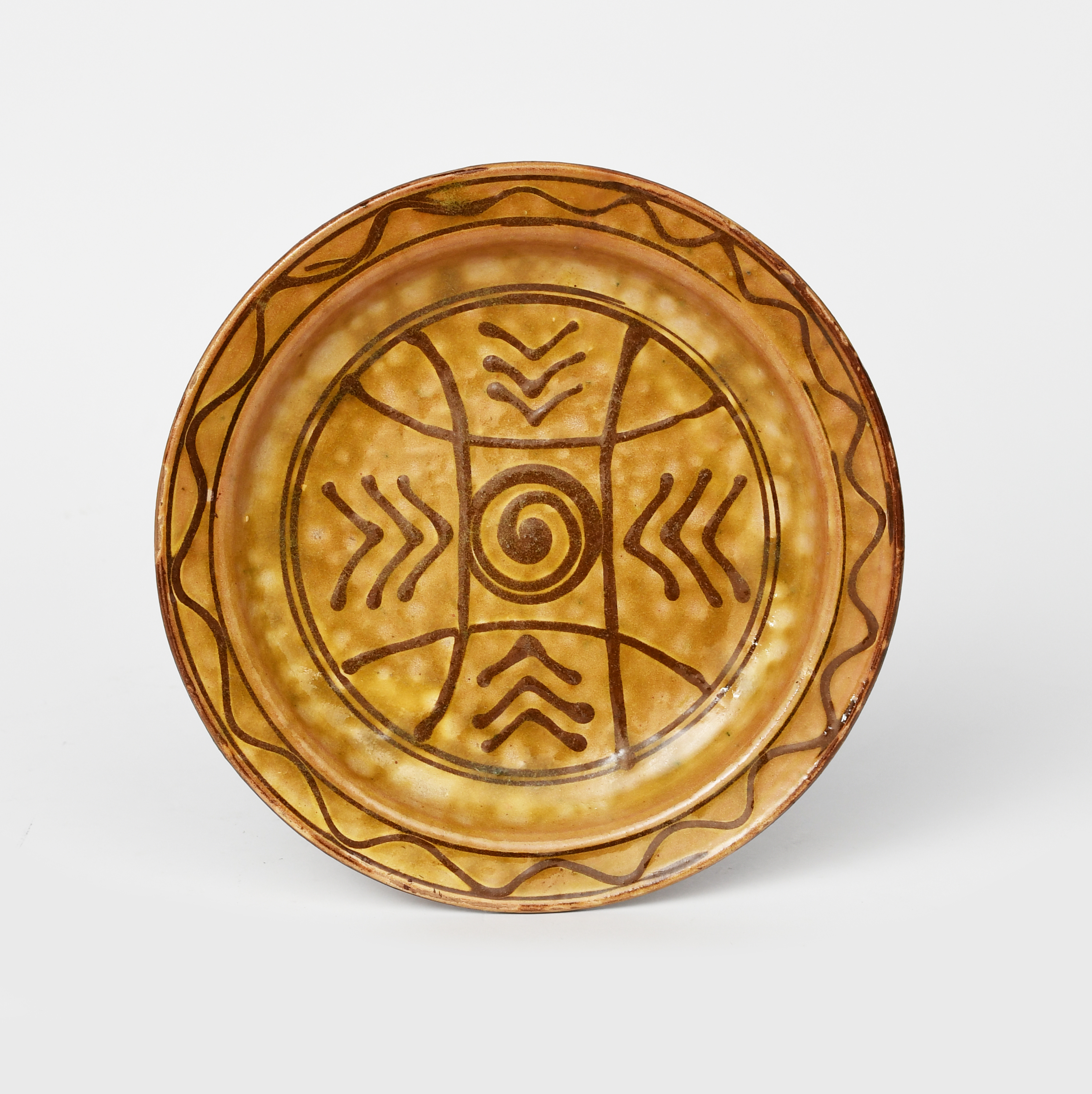 a Wenford Bridge plate, slip decorated with a cross motif with chevron and central spiral,