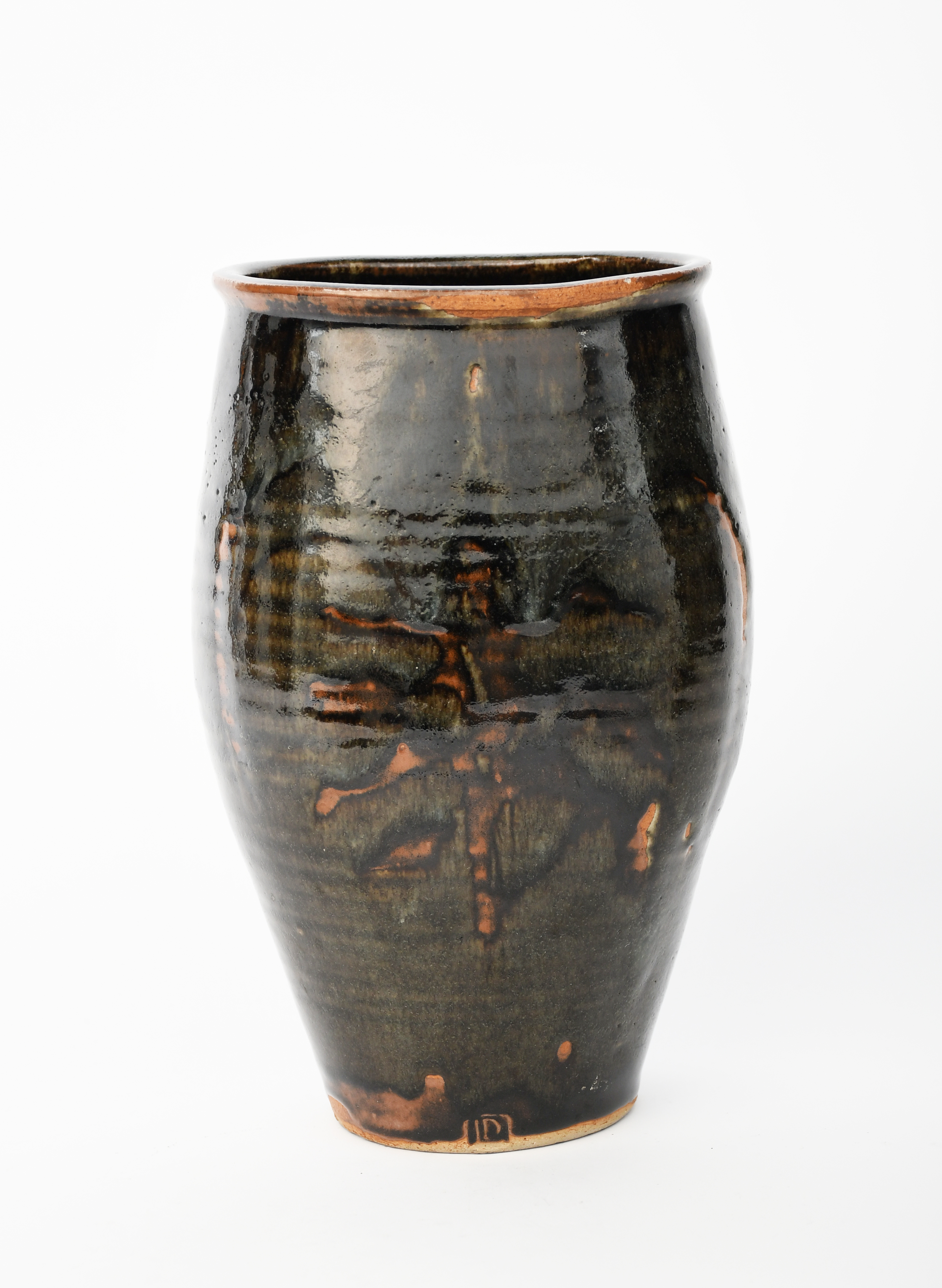 a Lowerdown Pottery stoneware vase, elliptical form, covered in a tenmoku glaze, with brushed flower stem
