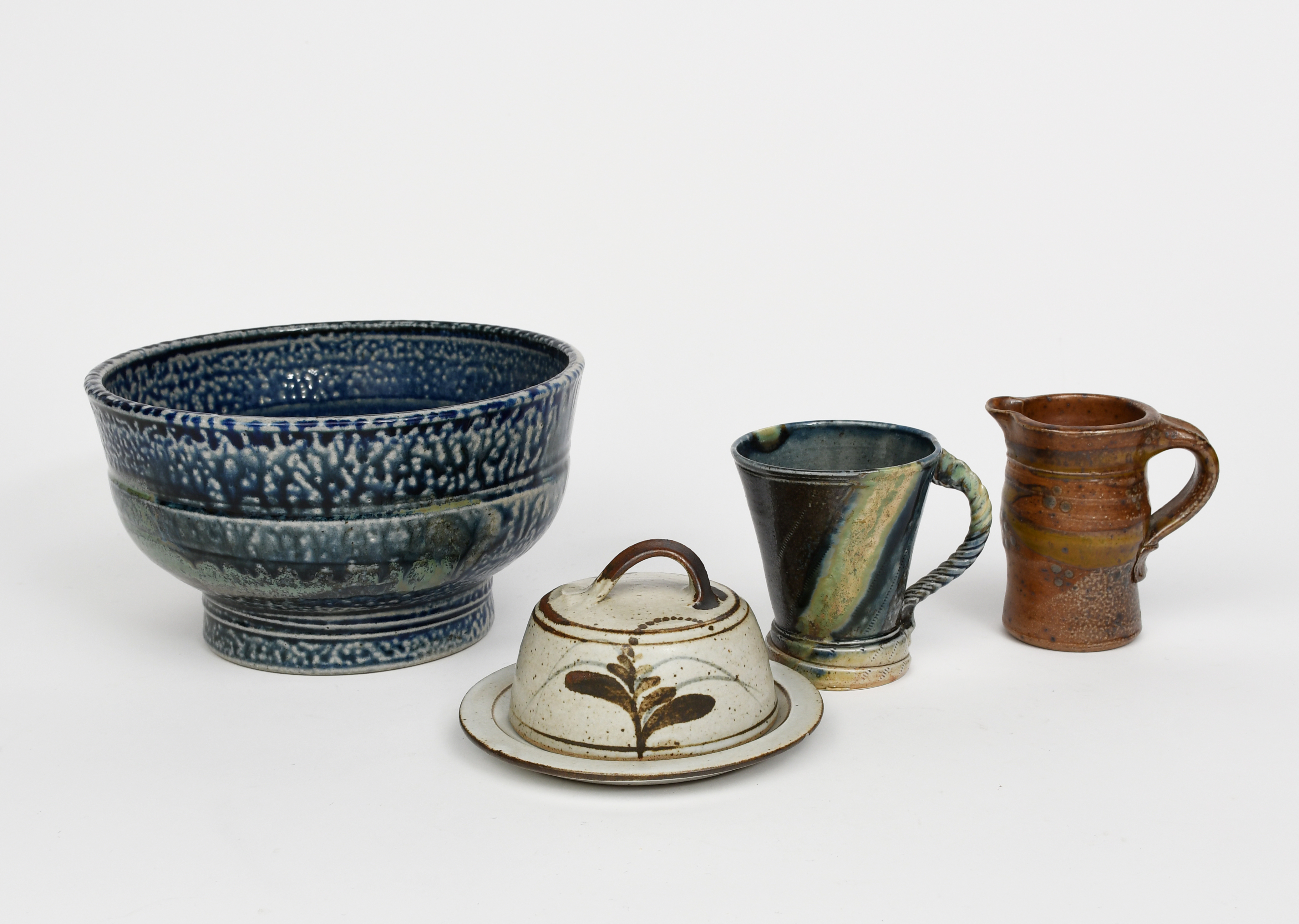 a salt-glaze stoneware bowl, footed form, glazed blue with green patches, the interior purple and blue, a salt-glaze stoneware mug and jug by Jane Hamlyn and a small Lowerdown dish and cover,