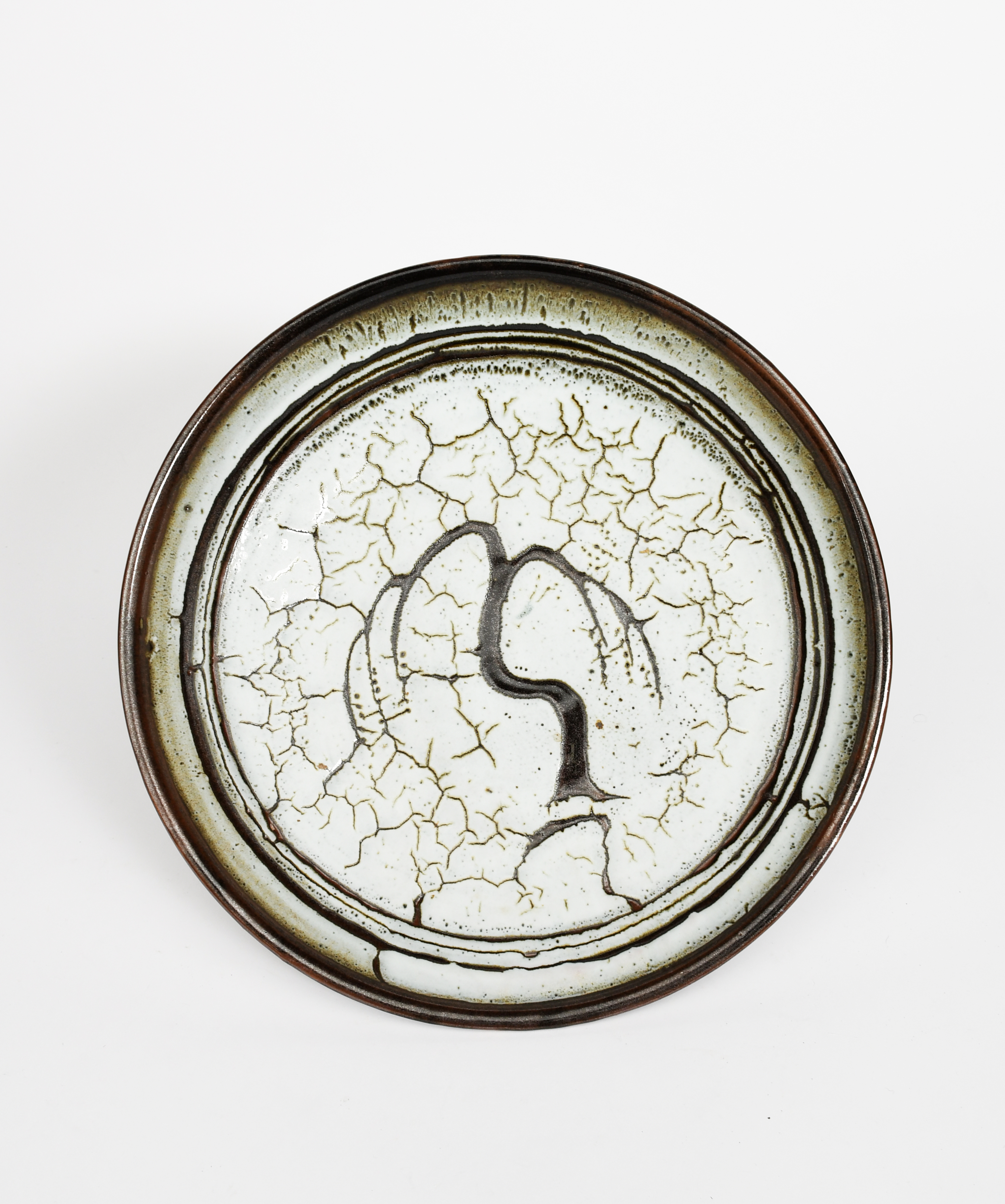 a Lowerdown Pottery Willow pattern stoneware charger, decorated in resist in Dolomite over a tenmoku glaze,