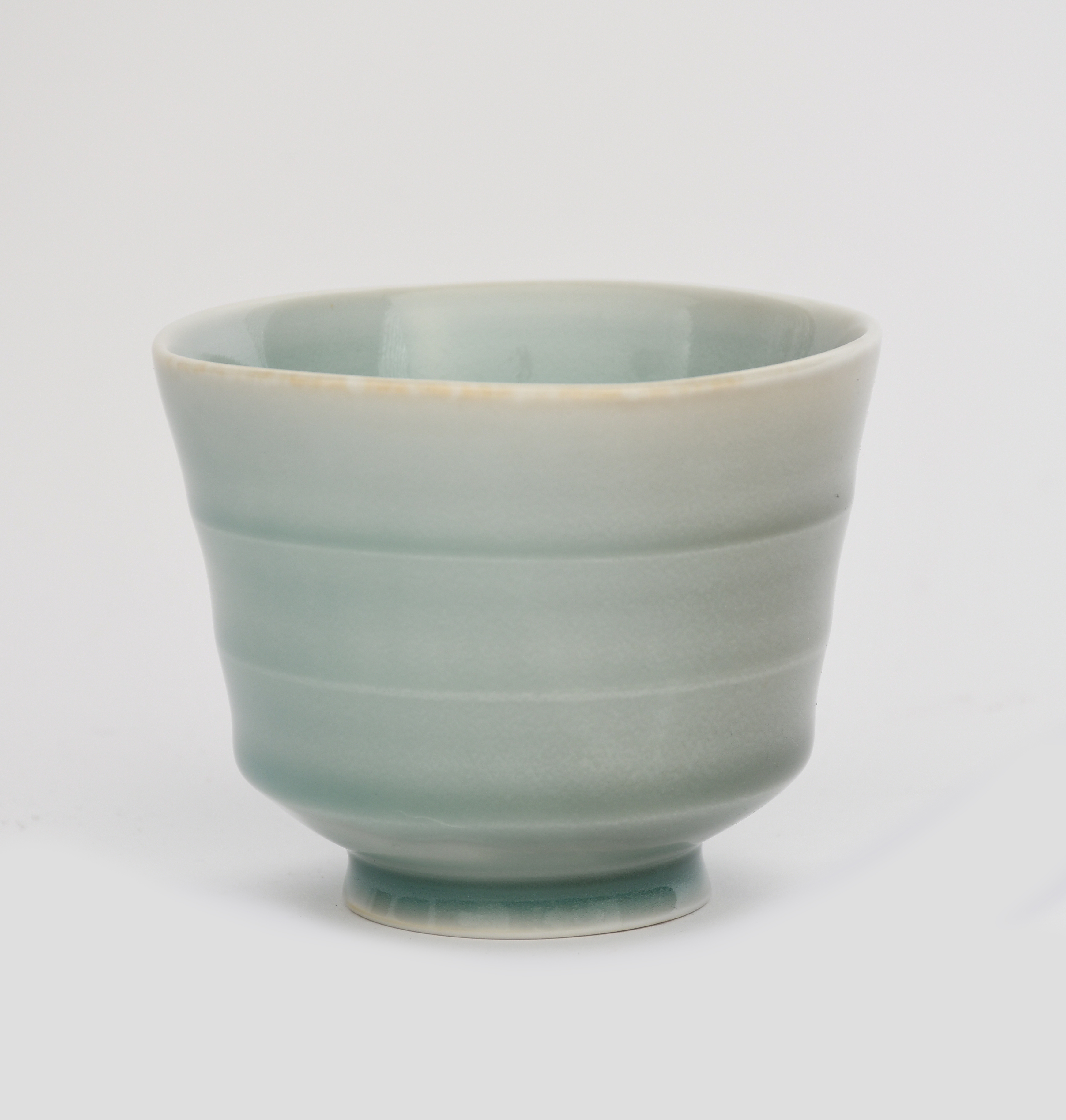 a porcelain unomi, footed form covered in a blue celadon glaze