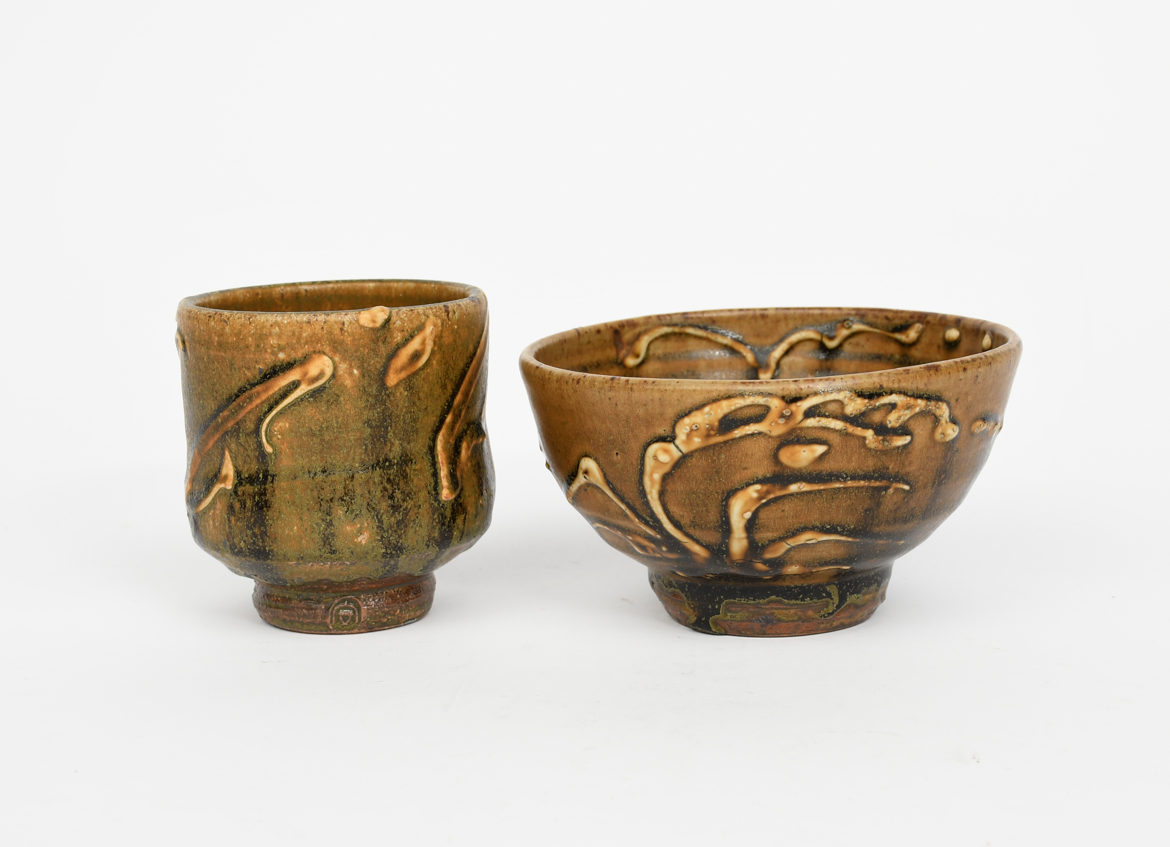 a stoneware footed unomi, waisted cylindrical form, brushed with thick slip decoration under an ash glaze, and a footed bowl by Takeshi Yasuda