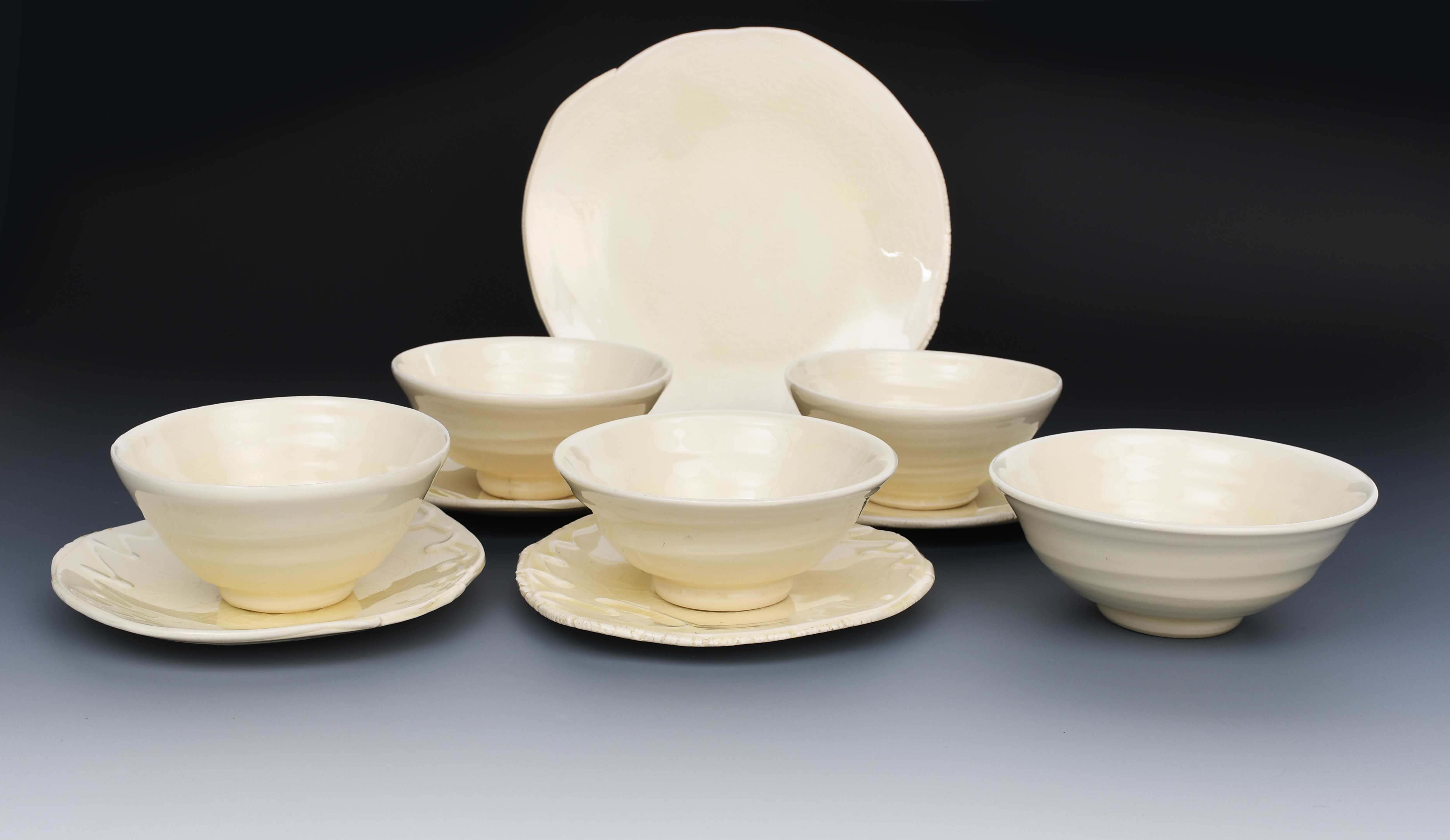 a creamware composite part service, covered in a pale honey glaze, comprising, five various bowls, four side plates and five dinner plates, some with slip decoration,