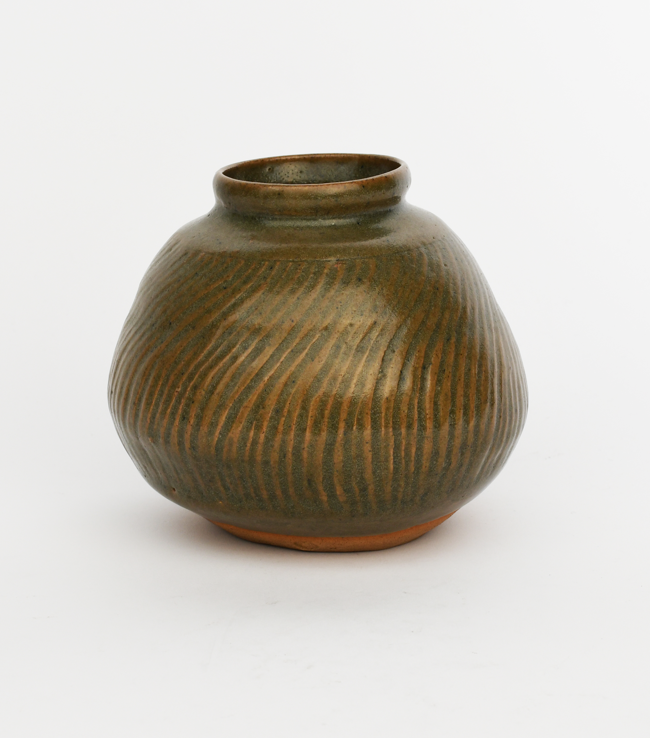a stoneware vase, shouldered form with broad band of incised decoration, covered to the foot in green ash glaze