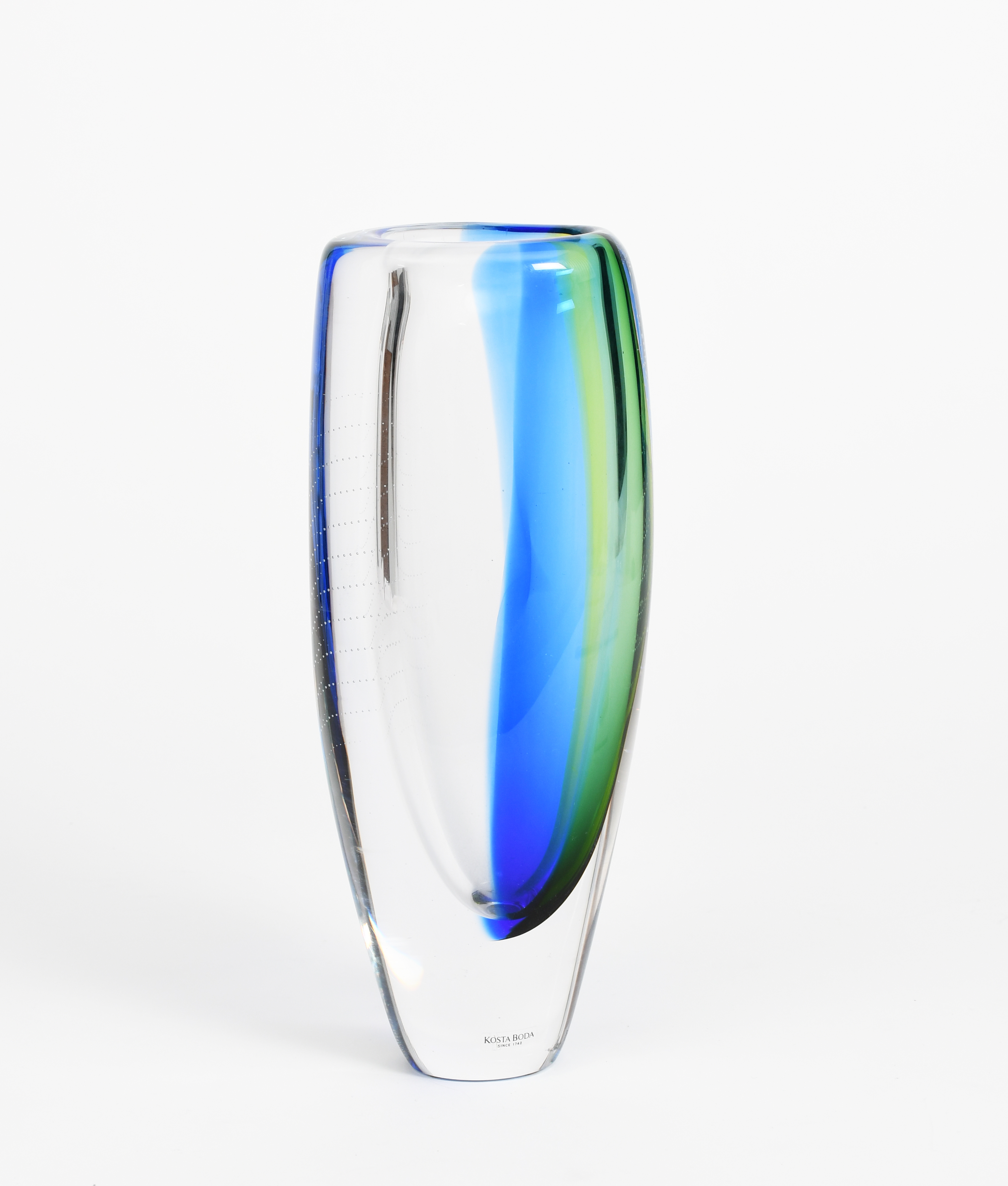 A Kosta Boda glass vase by Goran Warff, slender, swollen cylindrical form, blue and green striped glass cased in thick clear glass with lines of fine air bubbles, in original box, etched marks, 30cm. high