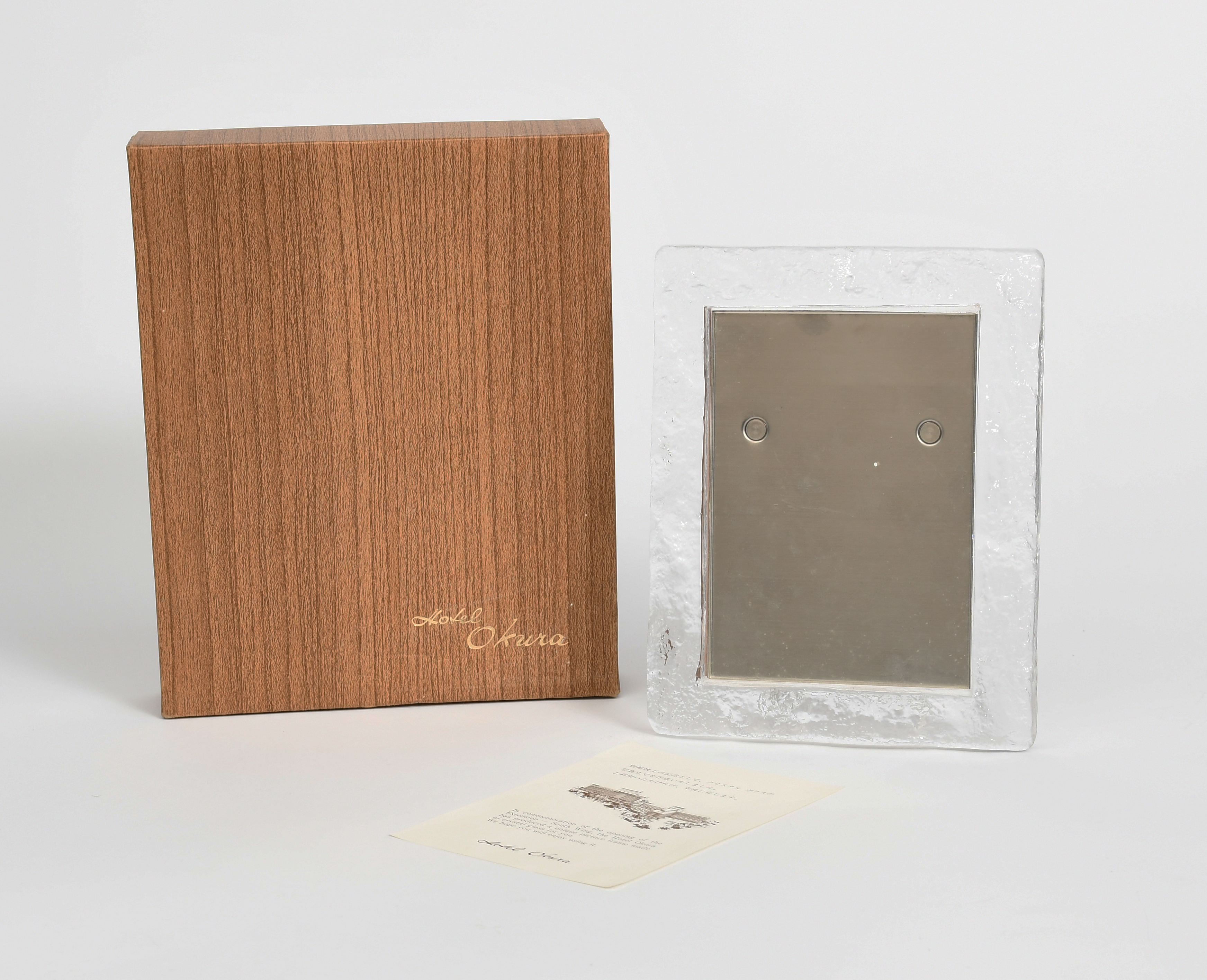 A Hotel Okura cast glass and chrome picture frame made as a gift for guests, marking the opening of the hotel's south wing extension, rectangular, textured clear glass frame with polished metal back plate, in original presentation cardboard box, applied label, 23cm. high