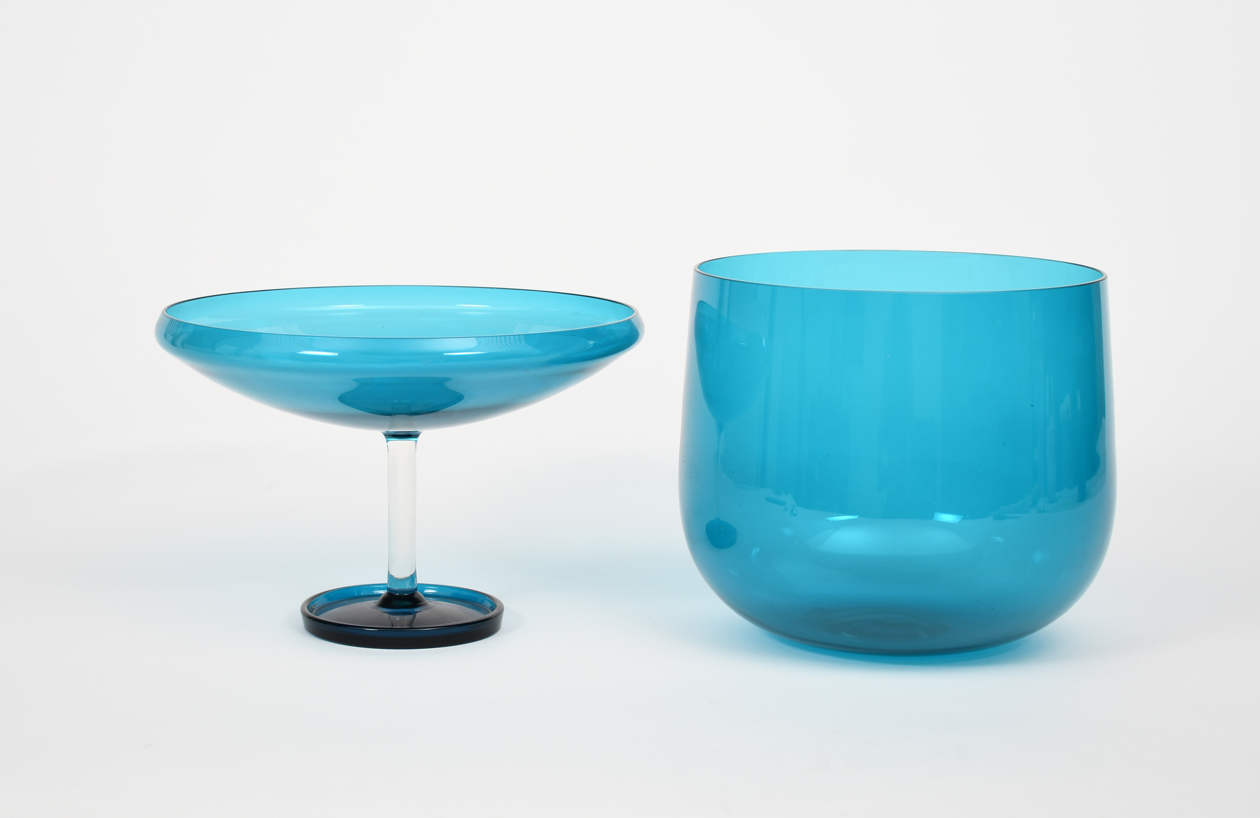 A Riihimaki Harlekiini (Harlequin) glass tazza and vase designed by Nanny Still McKinney, the blue glass shallow bowl tazza on clear glass stem, the vase of tapering cylindrical form, unsigned, 18.5cm. high (vase) (2)