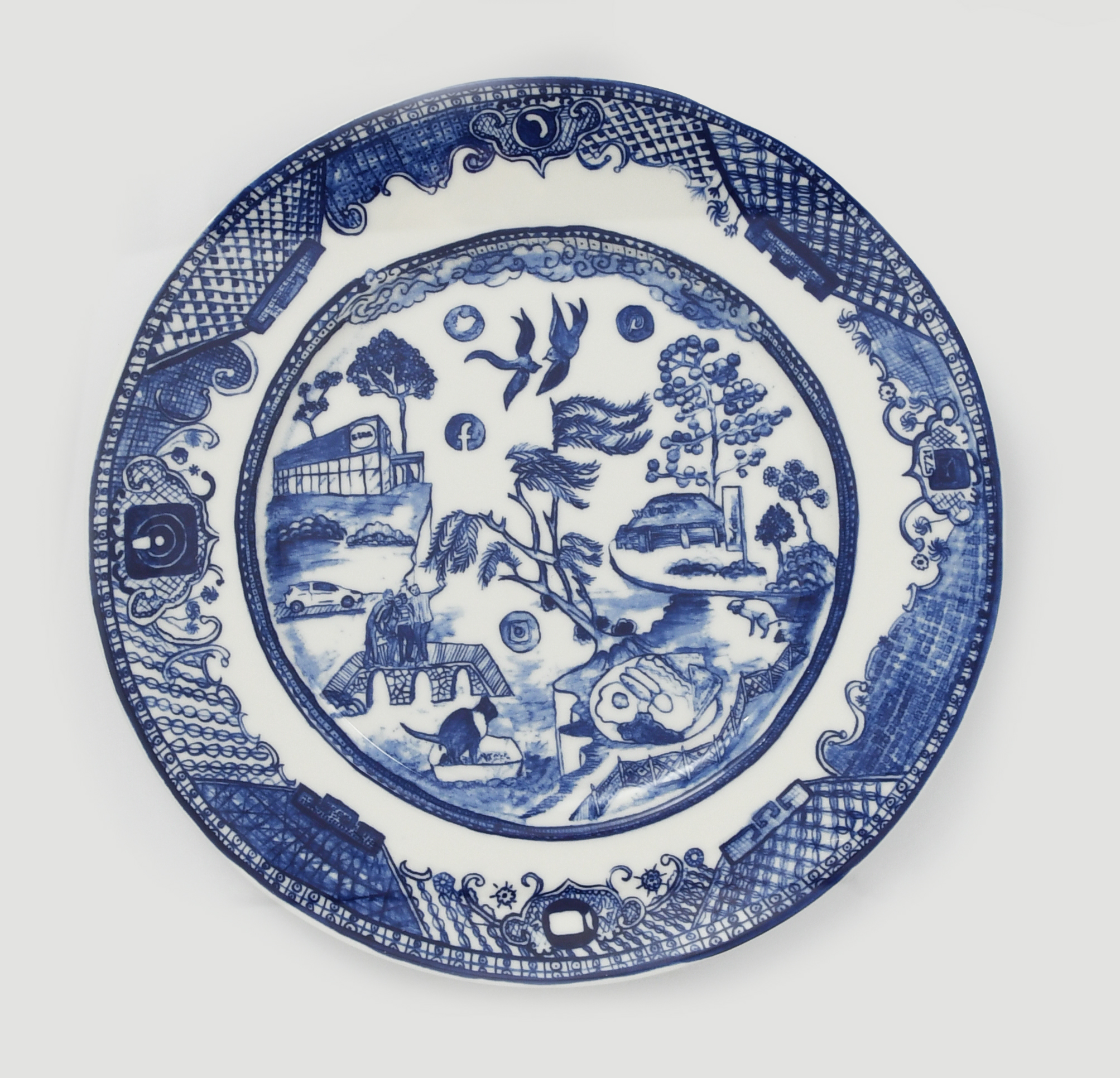 earthenware plate made for Grayson Perry's Art Club, printed in blue and white, framed