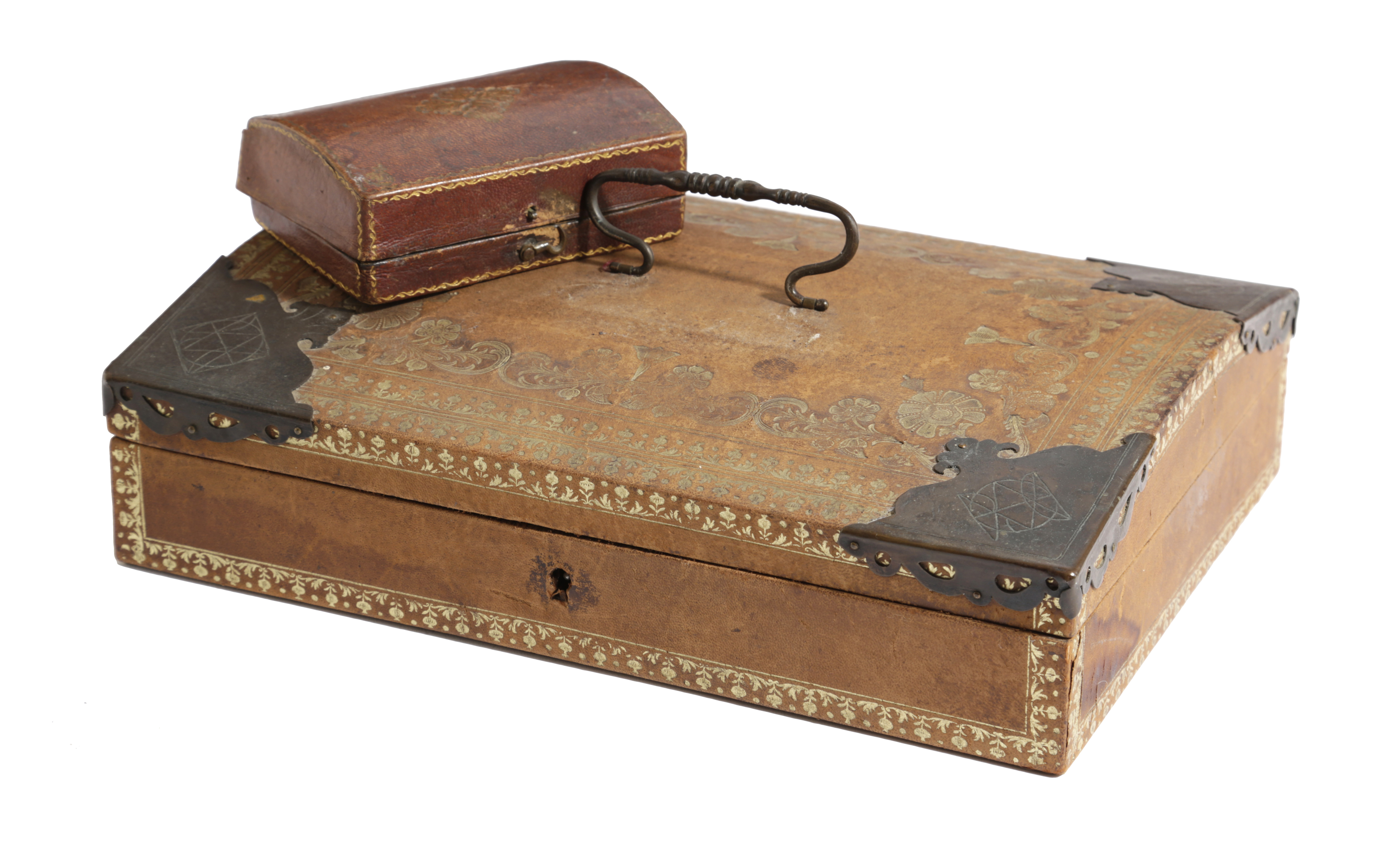 with gilt tooled floral decoration inside pierced brass corner mounts, enclosing a green silk lined interior, with gilt stamped retailer's marks, together with a smaller domed box and cover with similar decoration (2)