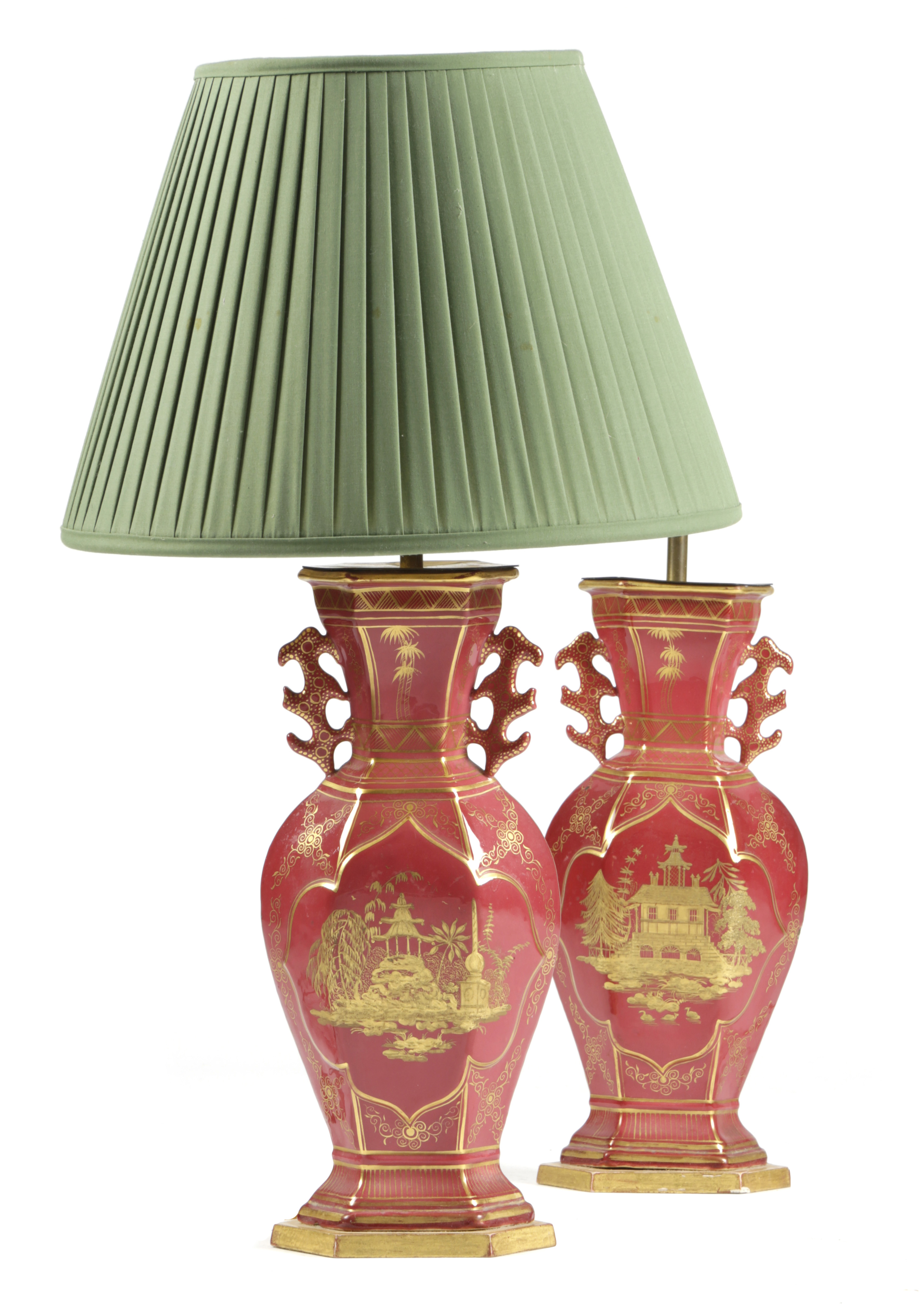 each decorated in gilt on a a maroon ground with pagodas and oriental style buildings, on a giltwood foot, fitted for electricity (2)