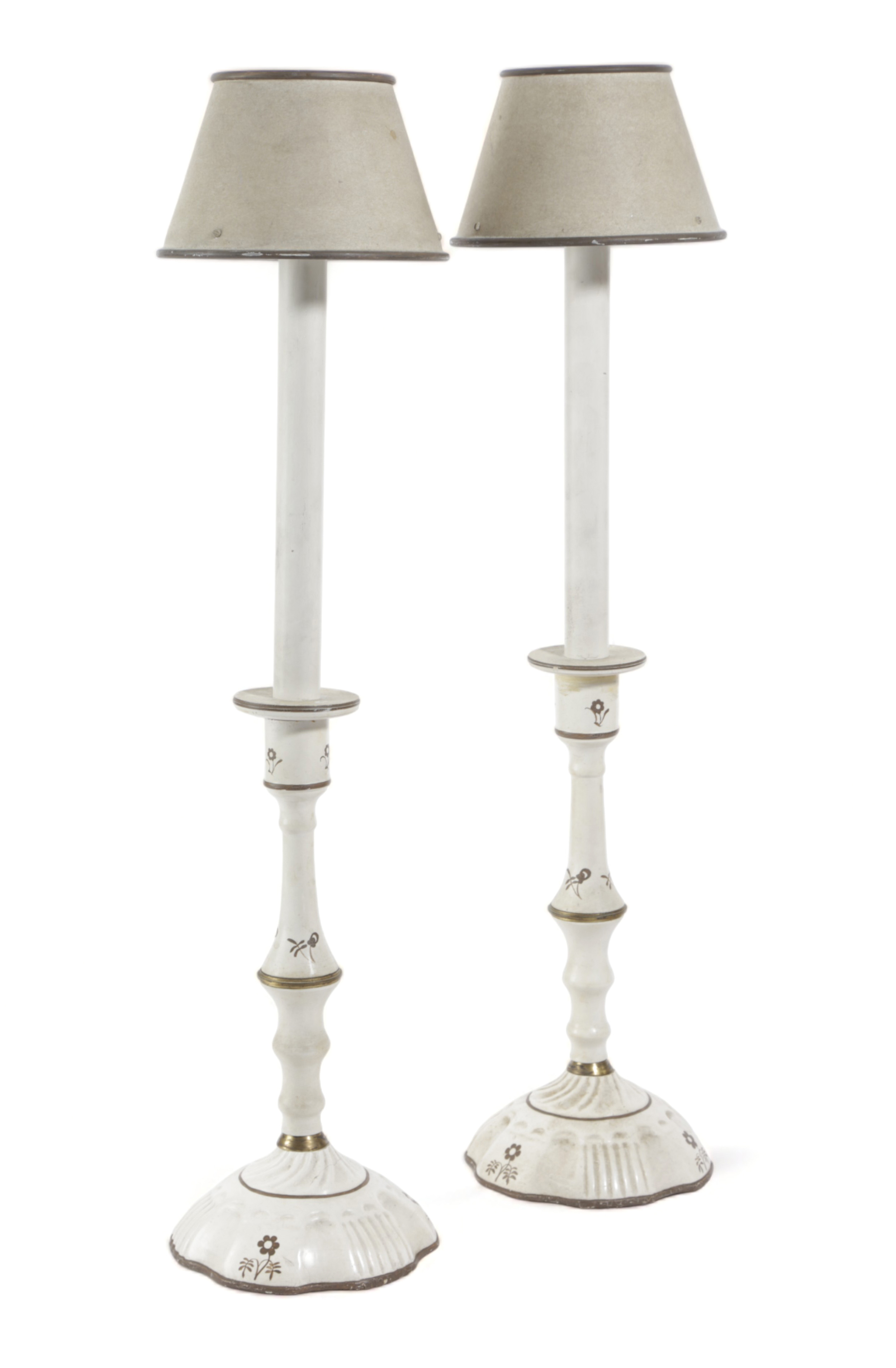 A PAIR OF PAINTED WOOD AND COMPOSITION CANDLESTICK TABLE LAMPS