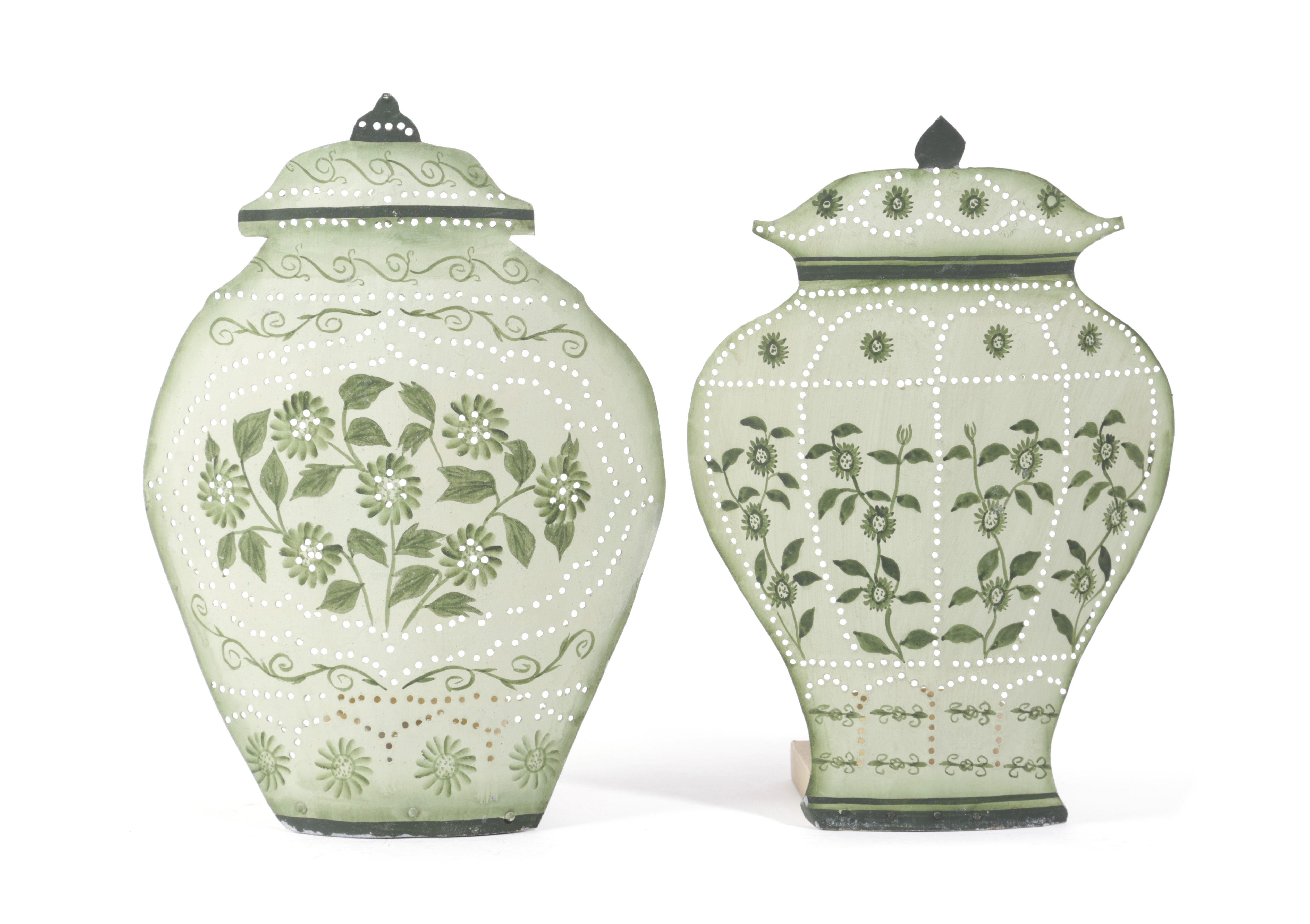 each of flat back form, pierced with holes and painted with scrolls and flowers (2)