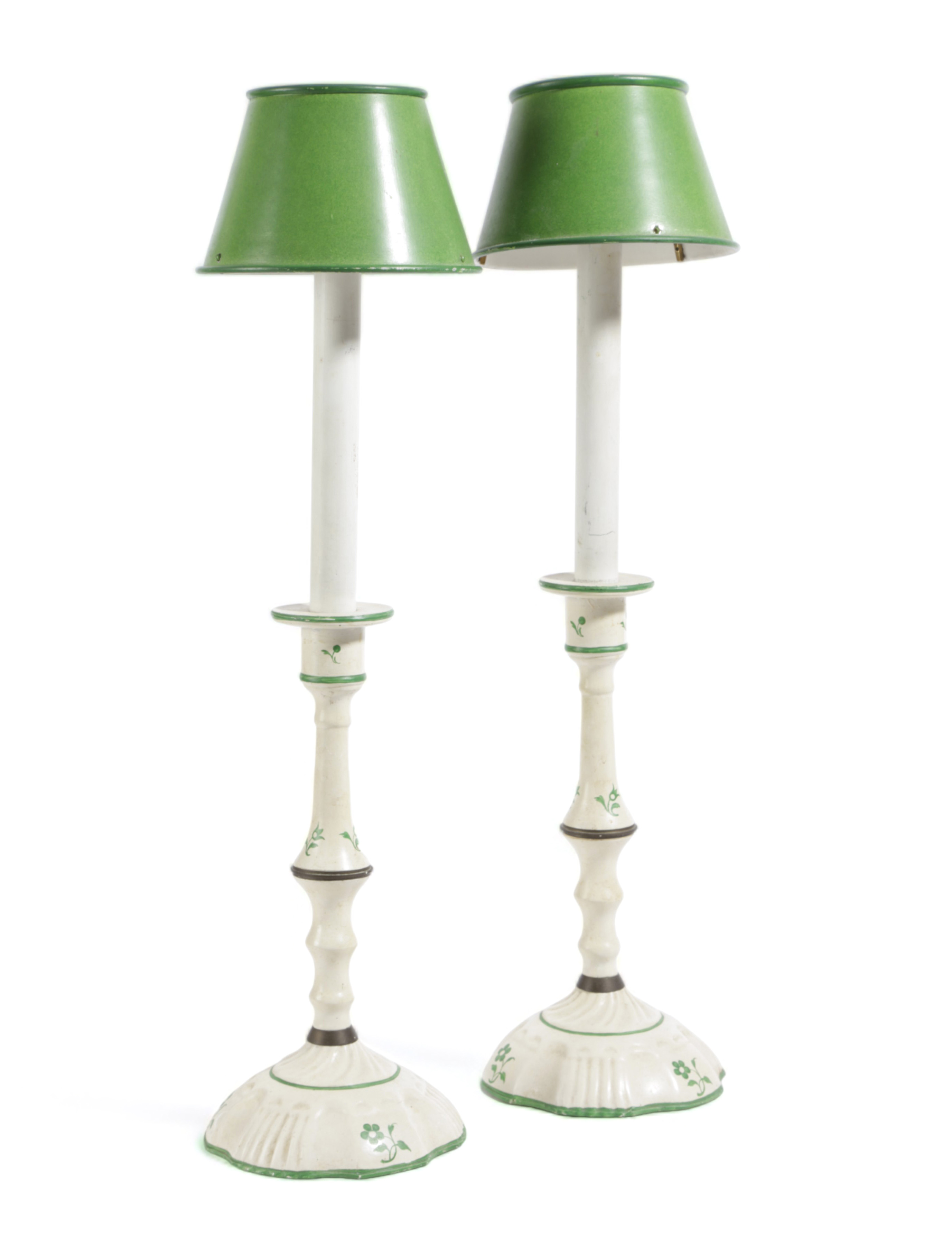after 18th century Battersea enamel models, each with brass mounts and decorated with green floral sprays, with a sprung stem and a green tôle shade (2)
